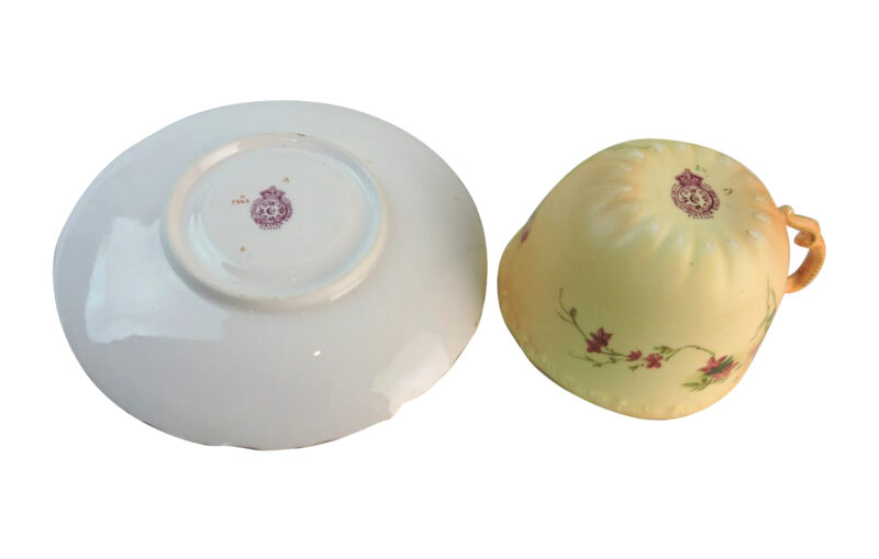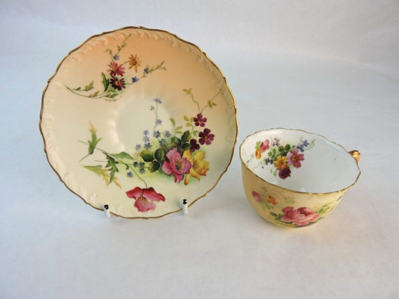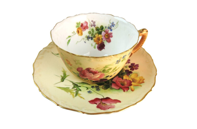 A beautiful Royal Worcester porcelain hand painted cup and saucer, signed “Royal Worcester, England” on the underside of both the cup and saucer and dated 1910.