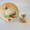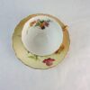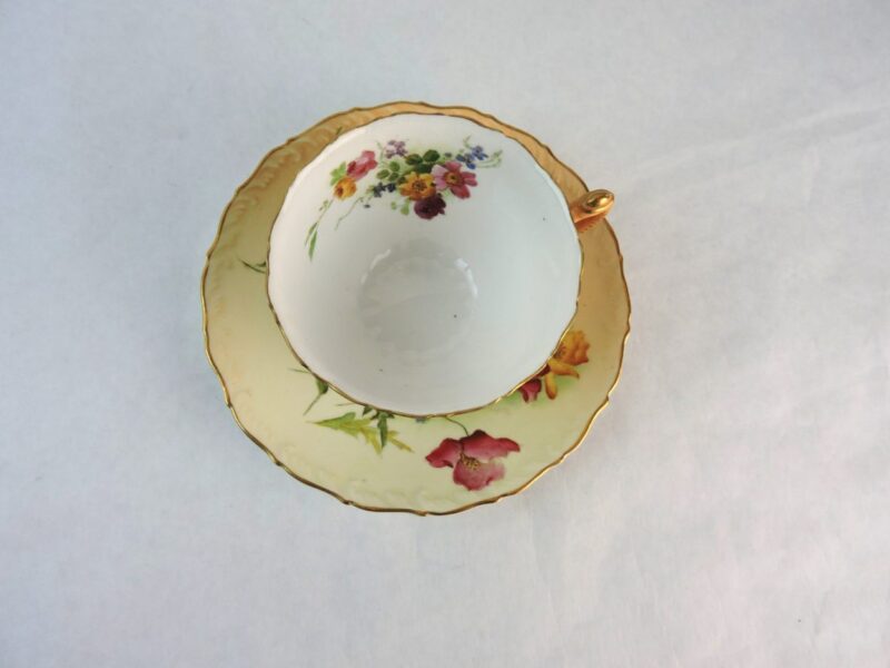 The inside of the cup plain white with a floral spray and the rest of the cup and saucer are done in the usual cream background and elaborately decorated with floral sprays.