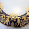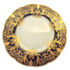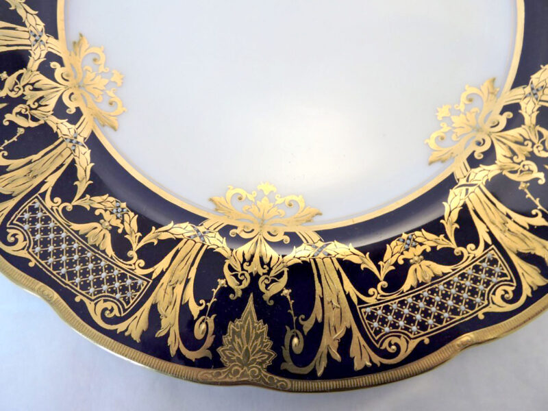 The centre of the plate is cream-coloured while the outside is lavishly decorated in a cobalt blue background with designs in heavy gold and accented with white enamel dots. The scalloped rim of the plate is gold with a design in the paint.