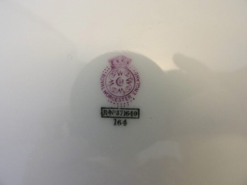 On the underside is the Royal Worcester factory mark as well as “Royal Worcester England”. the registration number of “371649”, another number “164” below that and “C 1093” painted on one side.