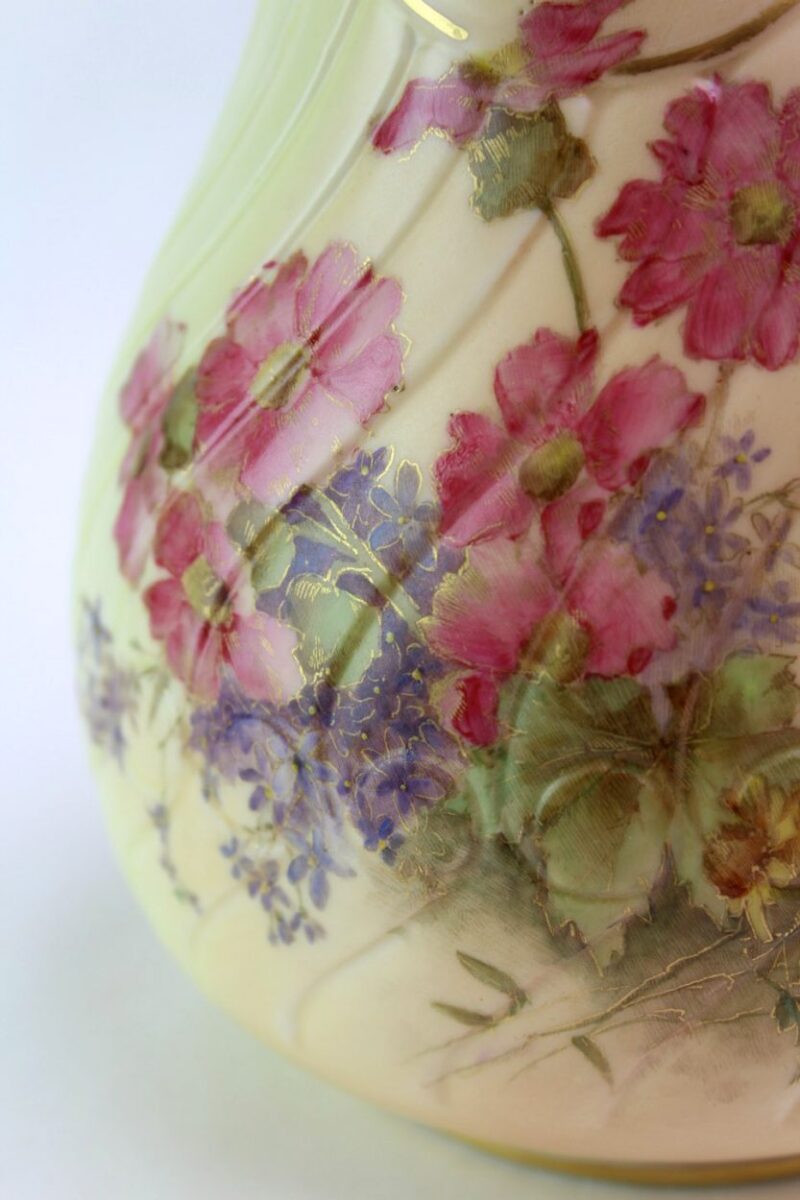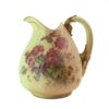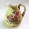 A lovely medium sized water jug with hand painted sprays of flowers on the front and back over a creamy yellow background on a swirled ribbed shaped body.  The jug is further decorated with gold highlights on the rim and handle and borders with hand painted florals.