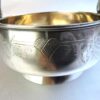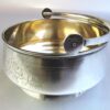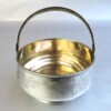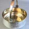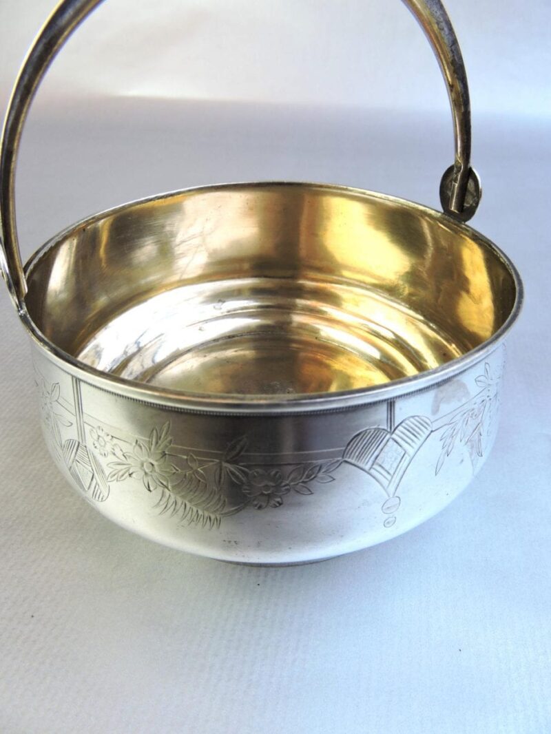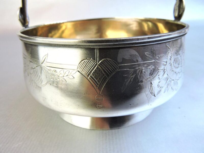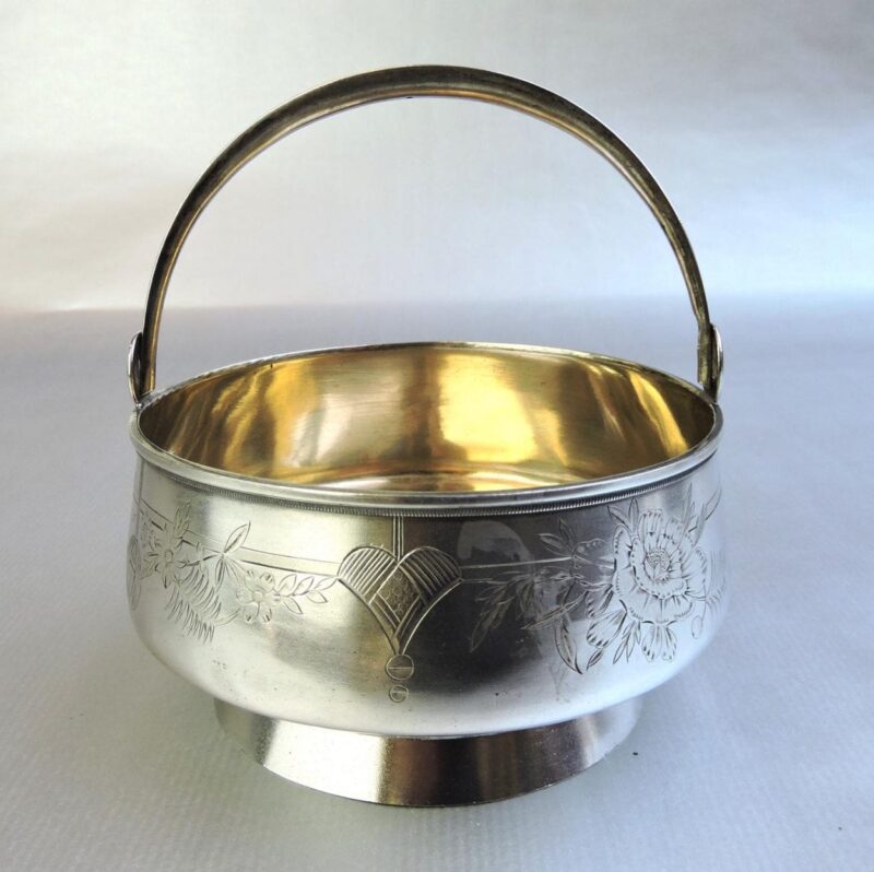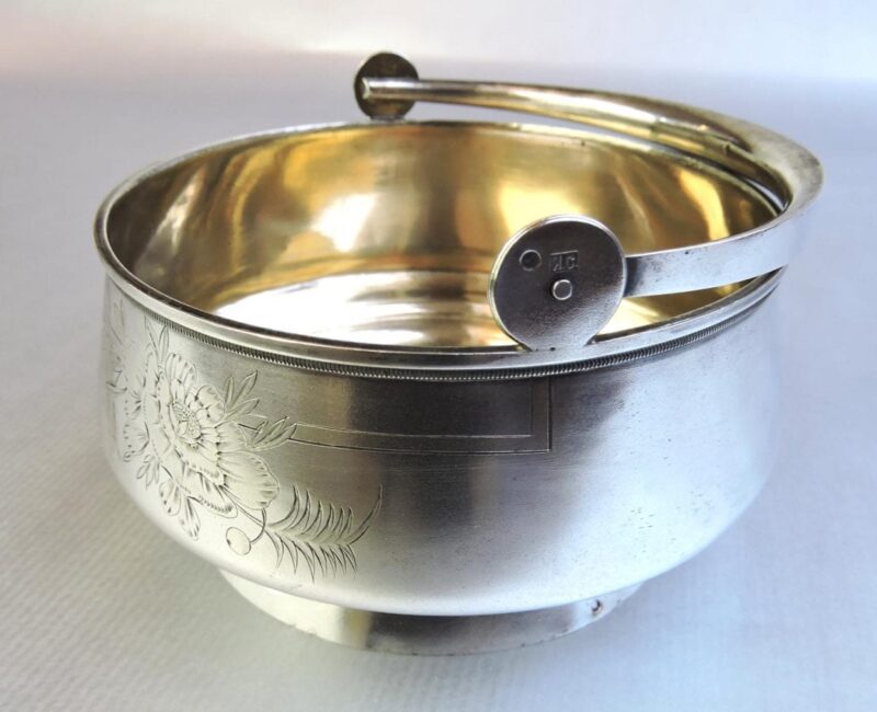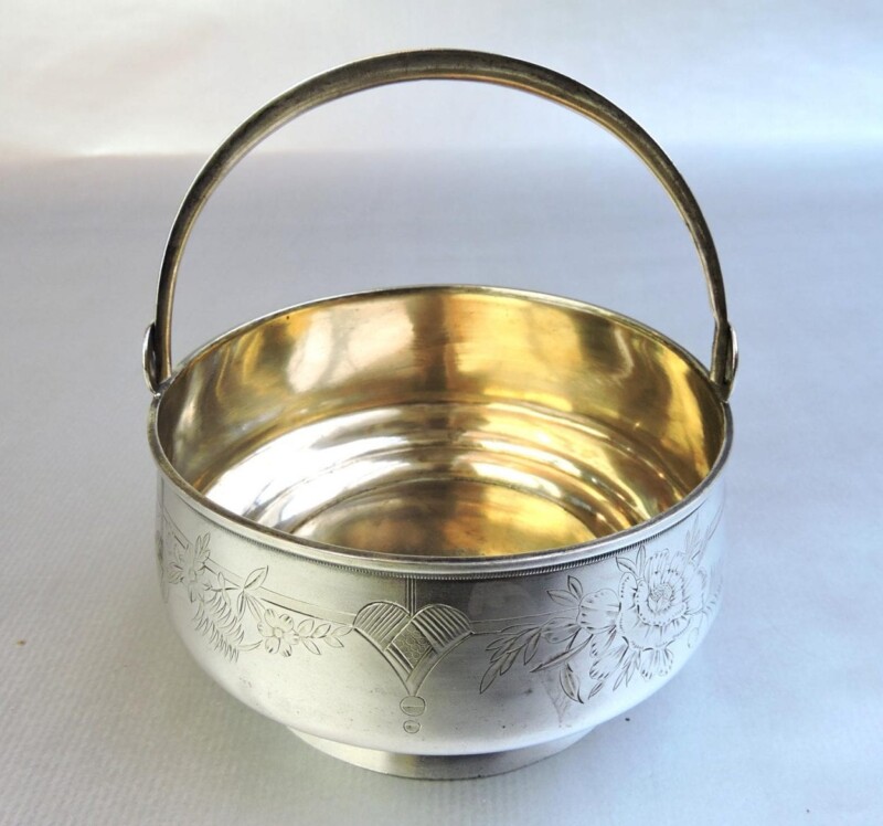 Silver HollowareHere is a very pretty Russian silver sugar basket on an attached base with embossed floral designs on the front, a movable handle, and a gold wash interior. The piece dates circa 1908.