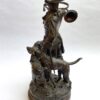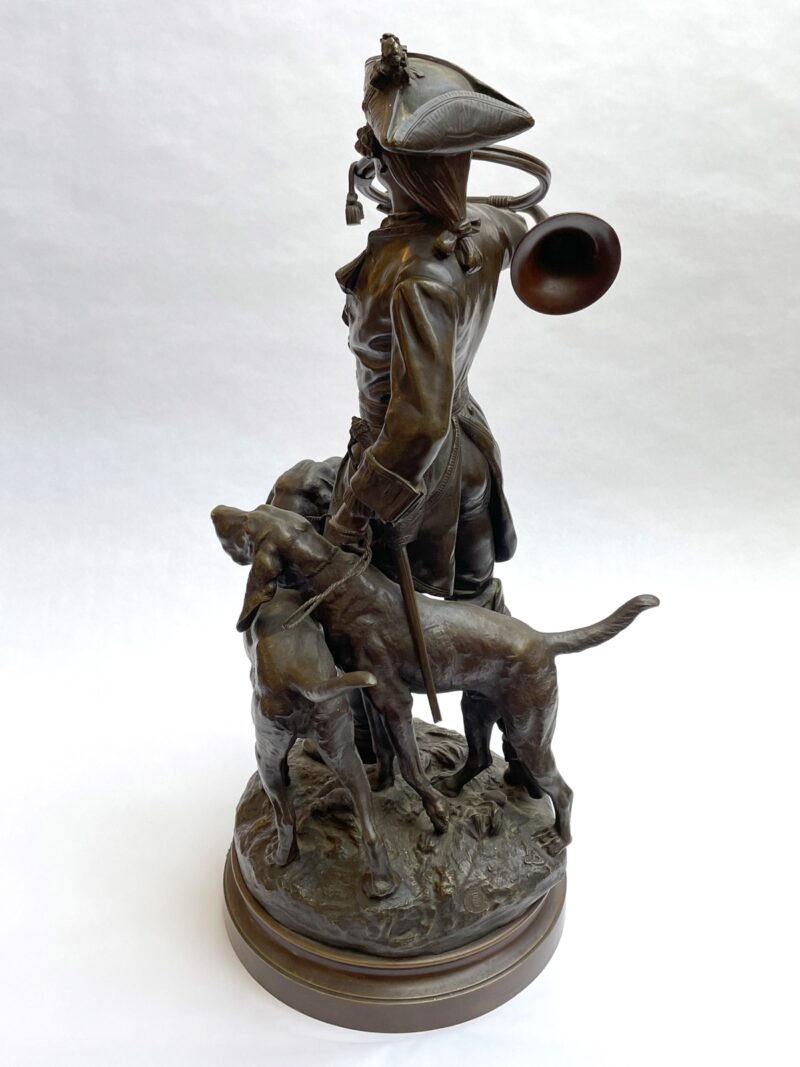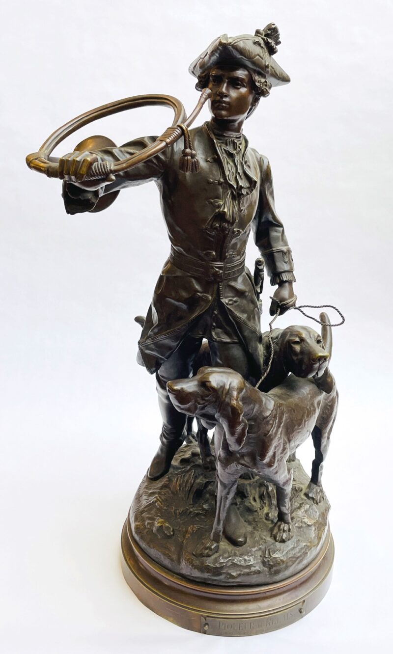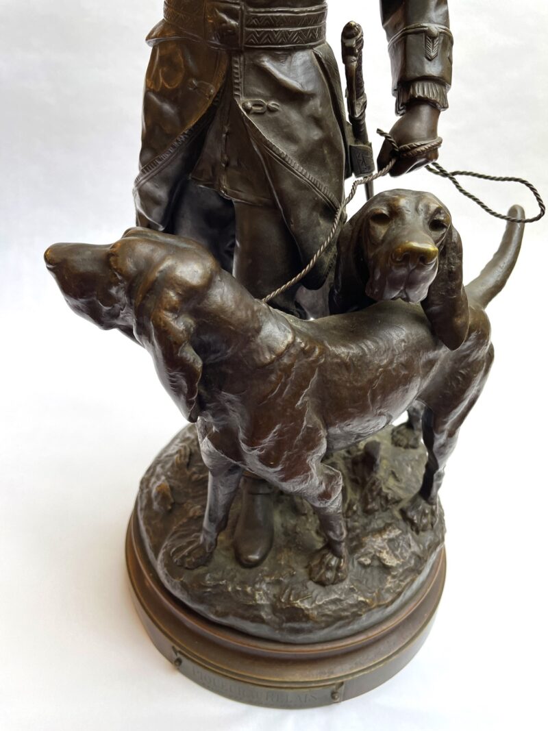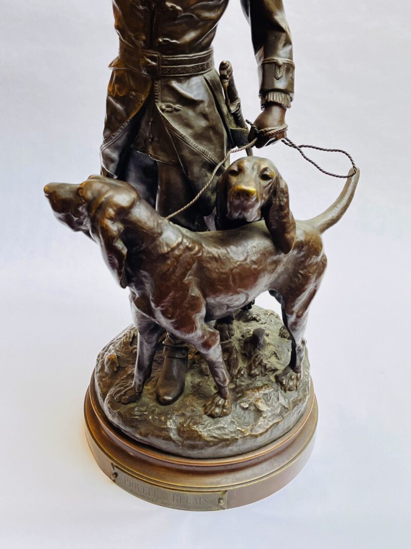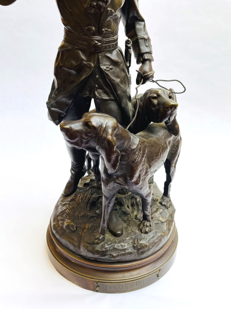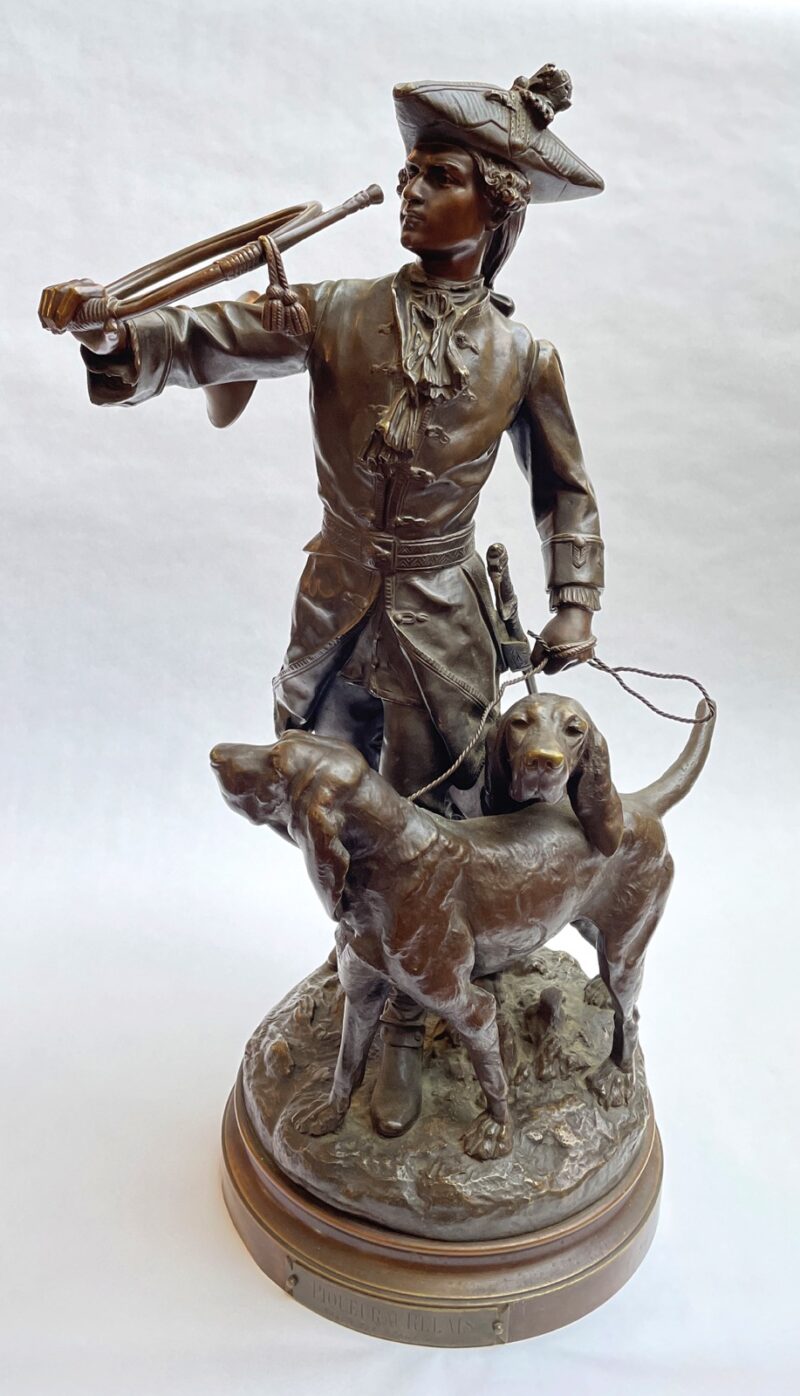 v** SOLD ARCHIVES **vA beautiful quality 19th century French bronze figural grouping of a hunter with horn and two hunting hounds by his side. Titled: “Piqueur au Relais” on the plaque at the front with “Salon des Beaux Arts” underneath the title. The Salon de Paris as it is known in French began in 1725 was the official art exhibition of the Académie des Beaux-Arts in Paris, France. Between 1748–1890 it was the greatest annual or biannual art event in the western world. Since 1881 it was organized by the Société des Artistes Français.