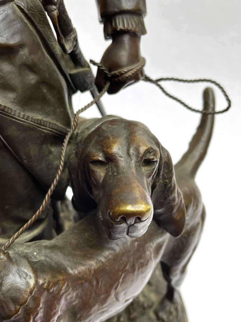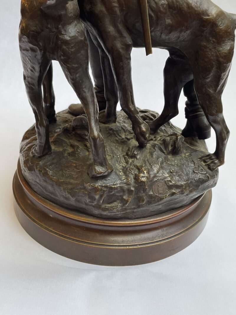 “Salon des Beaux Arts” – Large French Bronze Figural Grouping – Hunter & 2 Hounds – signed Hyppolite Francois Moreau (1832-1926)- “Piqueur au Relais” – Foundry mark for Sociéte des Bronzes de Paris