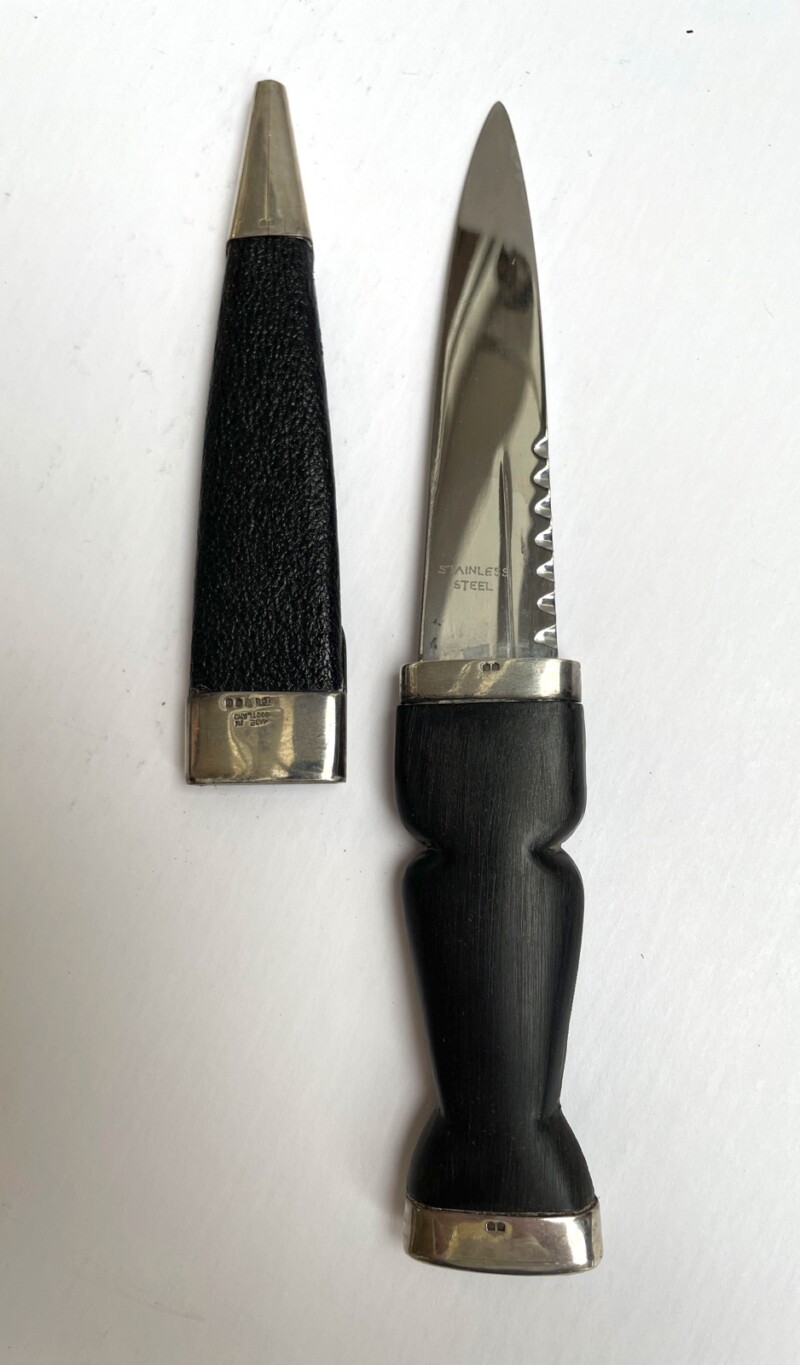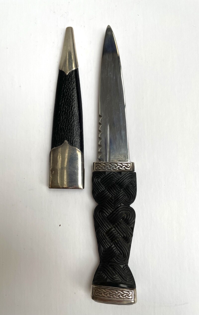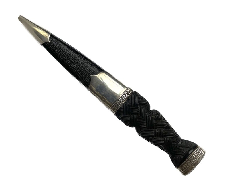 Scottish Hallmarked Sterling Silver Patterned Ebony and Leather Dirk / Dagger with Celtic Decoration. Edinburgh 1894
