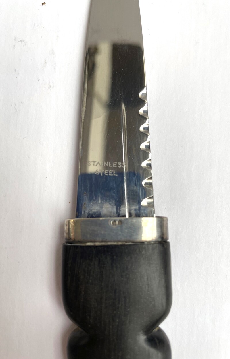 v** SOLD ARCHIVES **vA wonderful sterling hallmarked and Celtic decorated Scottish silver dirk / dagger with a patterned ebony and leather scabbard and a serrated stainless steel blade. The end of dagger is decorated with a faceted stone that looks like a citrine.