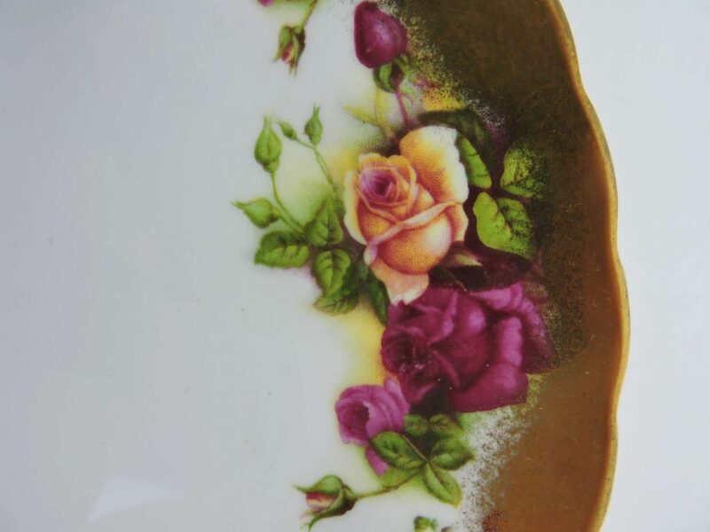 A stunning dinner set of 18 plates by Royal Chelsea, England in the ‘Golden Rose Pattern’. Each plate features a beautiful, yet warm colour composition of red, pink, peach and green with accents of gold on fine white bone china. The ‘Golden Rose Pattern’ is a combination of blossoming and budding roses around the centre, with a gold outer layer. The plate is a unique, yet sophisticated shape that mimic the form of petals with soft curved edges around the rim.