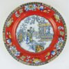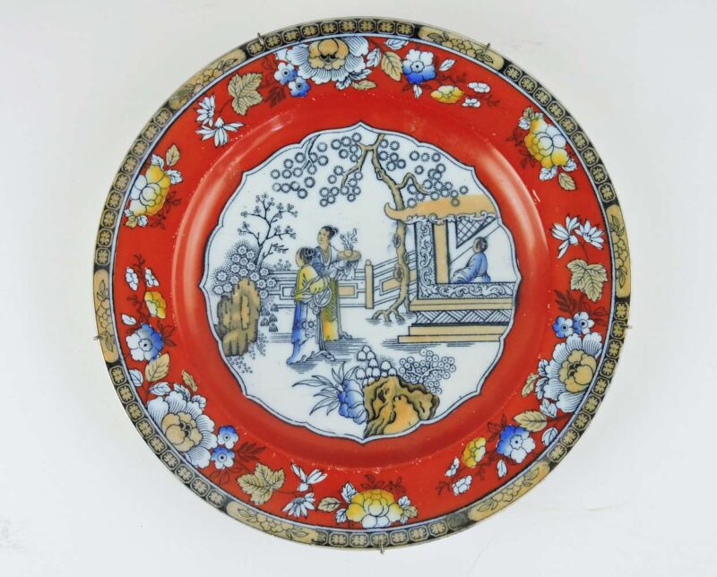 A set of 4 english chinoiserie plates, it dates 19th century. Each plate is beautifully painted with a western romanticized depiction of Chinese art influences, in the centre there is a delightful animated couple enjoying an everyday stroll on a bridge, followed by accents of blossoming flowers and leaf in a border design circulating around the centre. The set is a lovely colour composition of red, blue, green, yellow and orange.