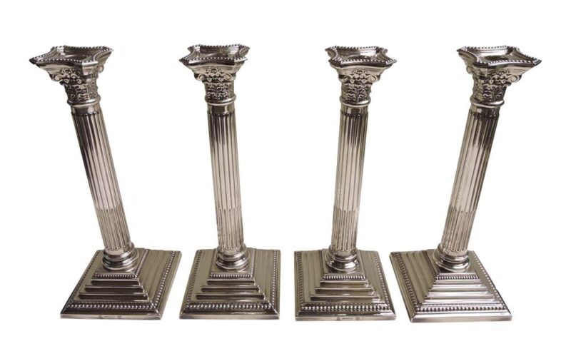 A lovely set of 4 matching candlesticks in a Roman Column design.  Marked with English Old Sheffield plate marks with the ‘Cross Keys’ – dates circa 1880.