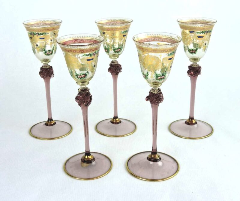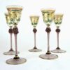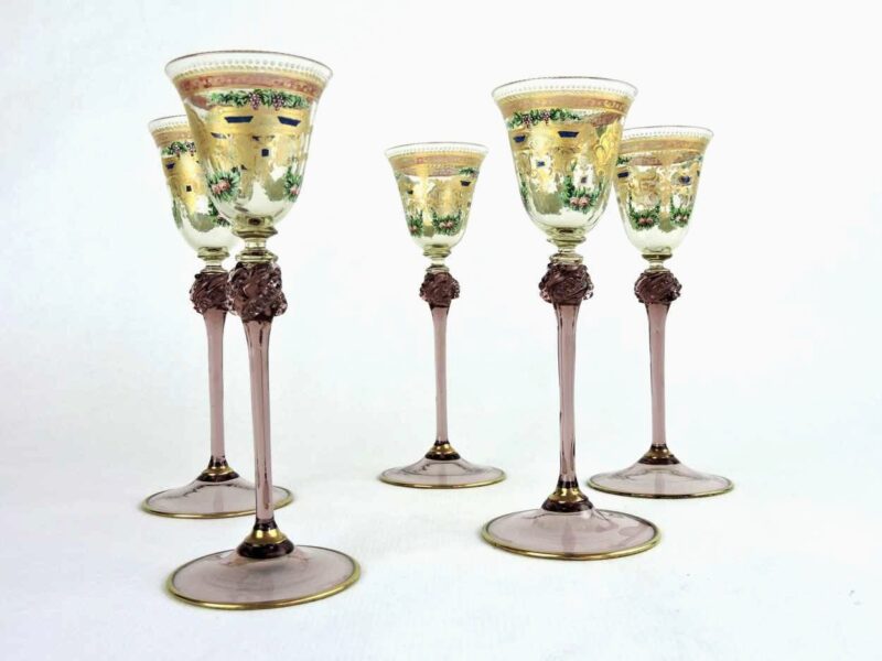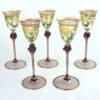 Set of 5 – Venetian Tall Stemmed Liqueur Glasses With Hand-Painted Grape Vine and Flower Pattern