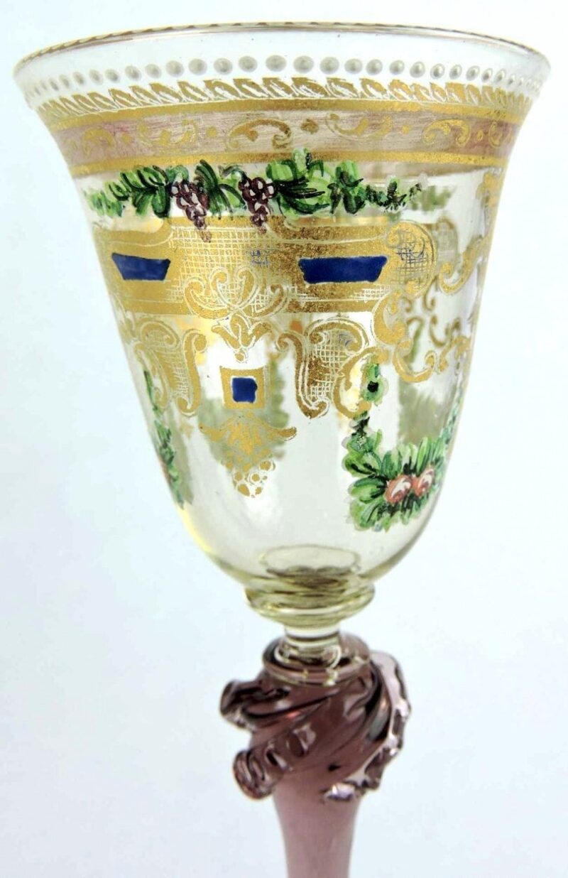 A gorgeous vintage set of Venetian tall stemmed liqueur glasses with hand-painted grape vine and flower pattern, it dates early 20th century. It features a delightful art glass stem in a light violet colour with a clear glass bowl. Each bowl is hand-painted in colours of green and violet, and encrusted with gold accents throughout. It has an unusual design that is rather whimsical, yet wonderfully perfect for a unique gift, or for special celebrations.