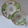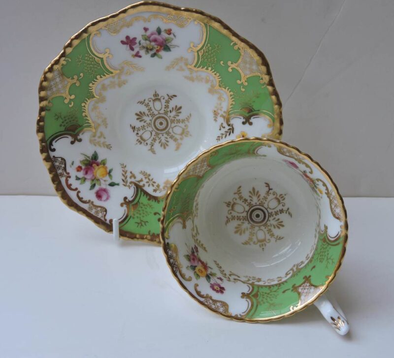 This set of 6 cups & saucers are by Coalport and are in a bright apple green accented with elaborate gold patterns. The hand painted floral sprays are inside the iconic “Batwing” shape. These saucers are scalloped with a beaded like rim.