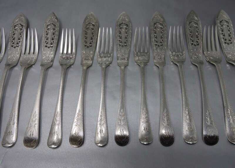 Set for 8 English Silver-plated Fish Knives & Forks – with Pierced Fish Knife Blades – Martin Hall & Co. c.1860