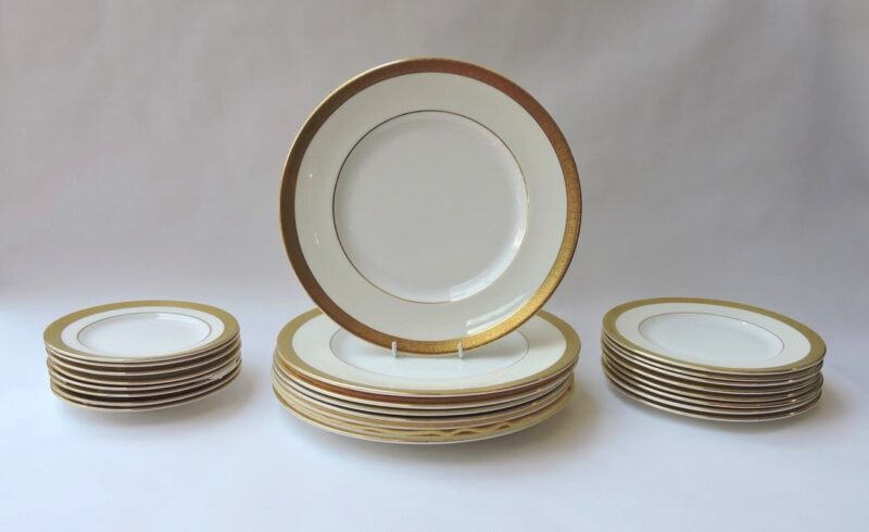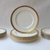 A ‘Set for 8 in “Buckingham” Pattern By Mintons’ – made in England. Each features a beautiful design with matching pattern, decorated with a lovely gold encrusted rim, cream rim and white center. Beautiful condition.
