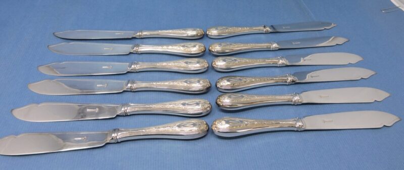 Set of 12 Roden Brothers Hallmarked Sterling Silver Fish Knives – “Stratford Engraved” Pattern, Initialled “M”