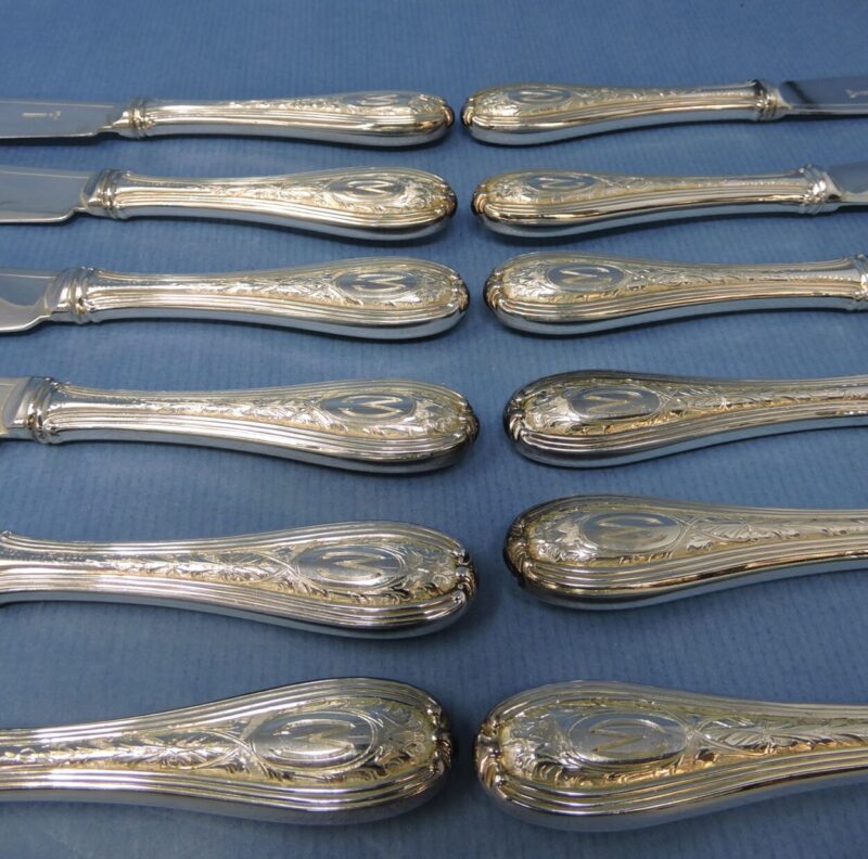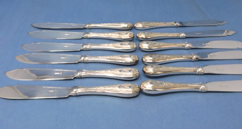 Silver Serving PiecesA lovely set of 12 sterling silver hallmarked fish knives in the “Stratford Engraved” pattern, made by Roden Brothers, England. The set is initialled with a “M” on each handle.