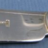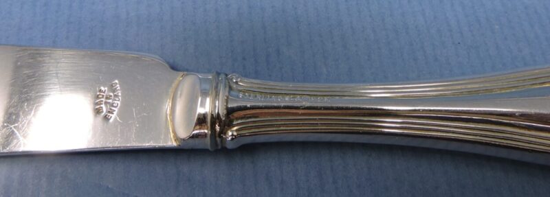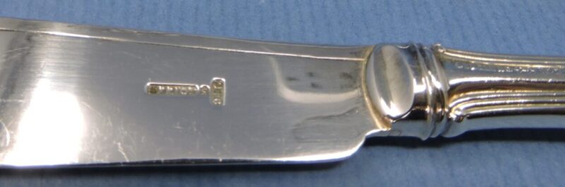 The blade of each knife is stamped “Elliot S ” on one side and “Made in England” on the other side. The handle of each knife shows the English hallmarks for Roden Brothers and reads “Sterling”.