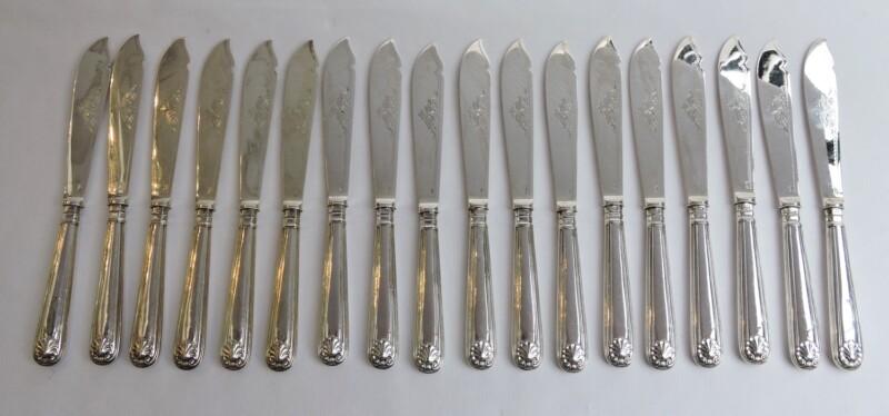 Set of 18 Sterling ‘Fiddle, Thread & Shell’ – Fish Knives with Sterling Handles & Blades – Elkington & Co. 1908