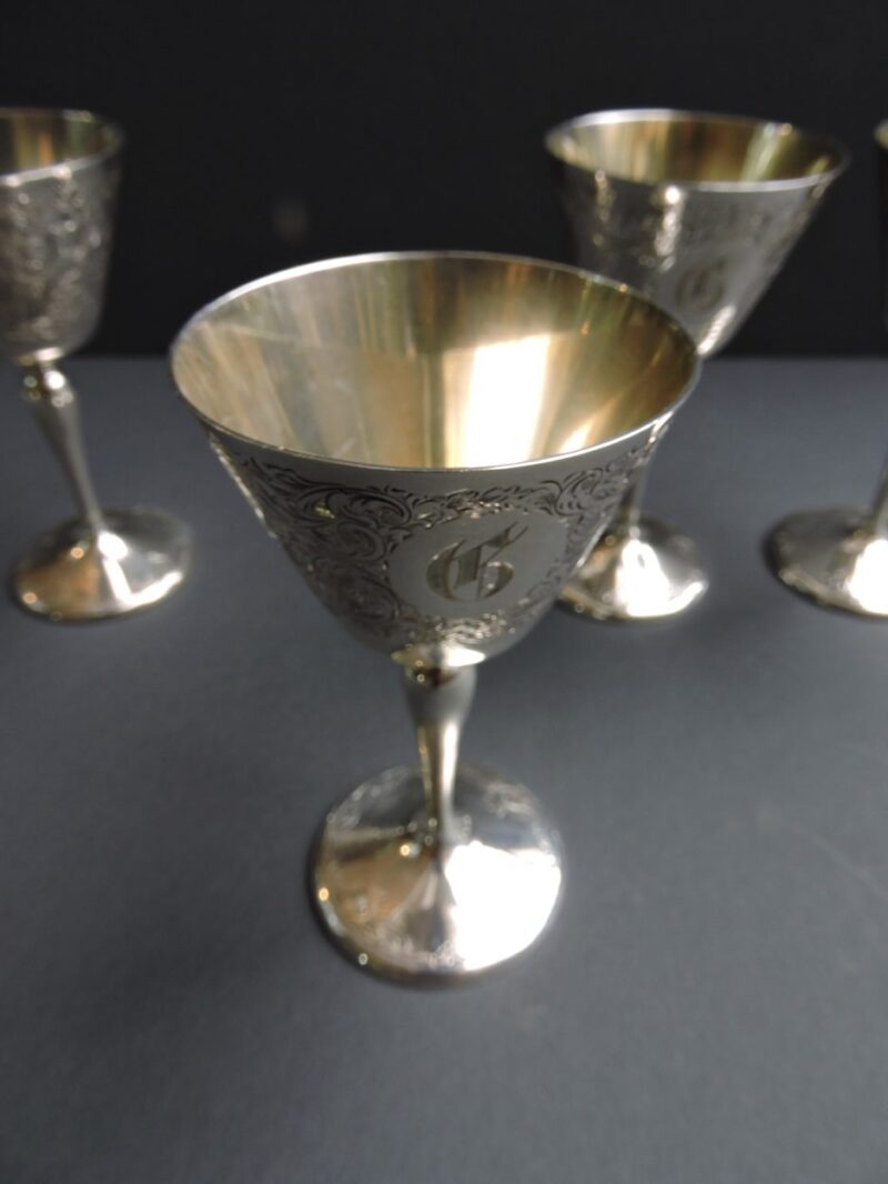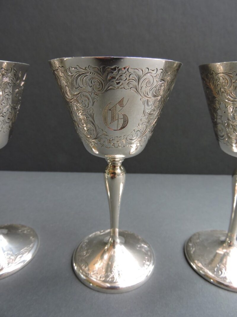 A lovely set of stemmed cups  or ‘sherry glasses’ by Birks in Sterling silver with beautiful hand chasing around the entire cup with a monogram “G” in the centre of the cartouche.  The interiors of the cups are gold washed.