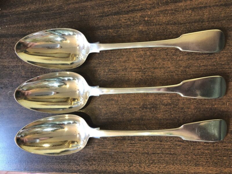 A ‘Set of 3 – English Hallmarked Sterling – Large Table Spoons -London – George III Period- features 3 English Hallmarked Sterling Table Spoons – London, GeoIII dated 1822, Maker: Thomas Wilkes Barker.