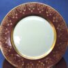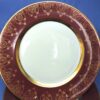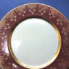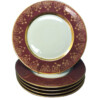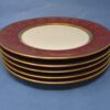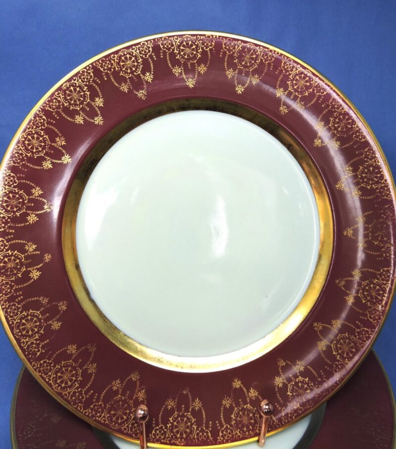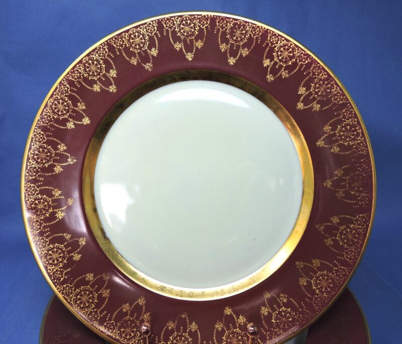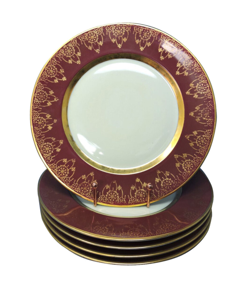 v** SOLD ARCHIVES **vA wonderful set of 5 Heinrich & Co. Bavaria porcelain dinner plates. The plates have a white background with burgundy around the outside and are decorated with 22 karat gold around the centre and around the plate rims. There is also a gold pattern on top of the burgundy.