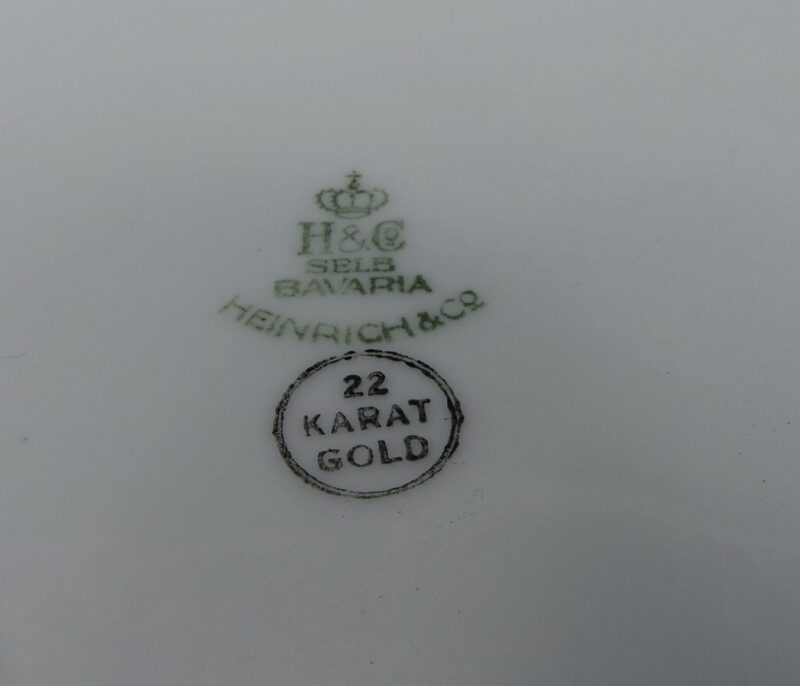 The underside shows the maker’s mark in green and reads “H&C. Selb Bavaria. Heinrich & Co.” and, in black paint, “22 karat gold”. There is also an embossed stamp “6504” on each plate.