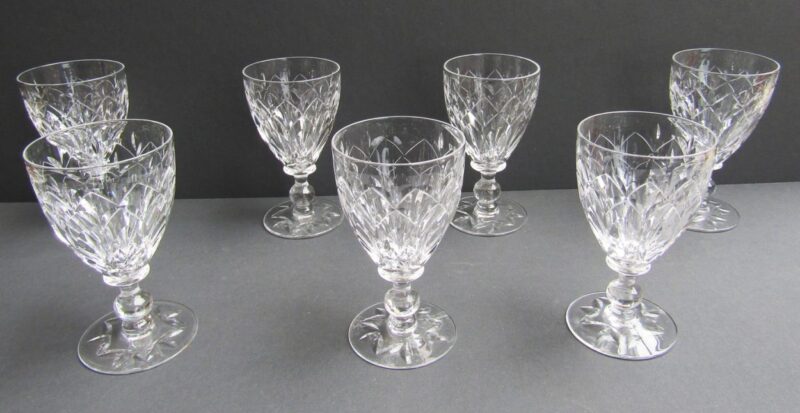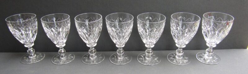 A lovely set of 7 signed Stuart England crystal white wine glasses. Each glass is 4 5/8 inches tall. All of the set are signed “Stuart England” on the underside of each glass.