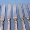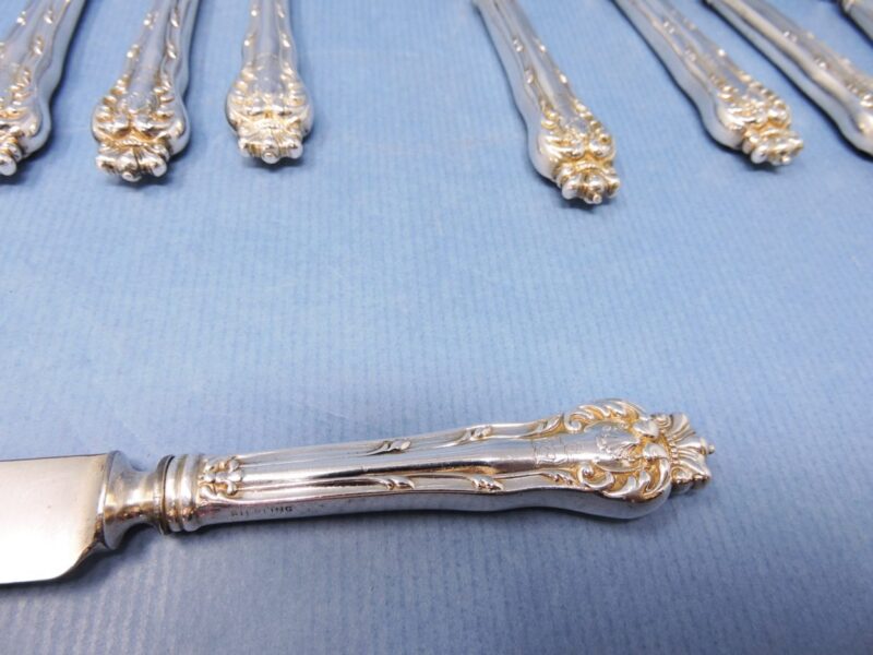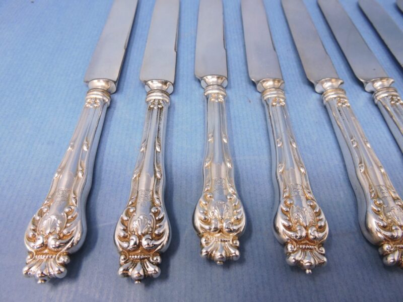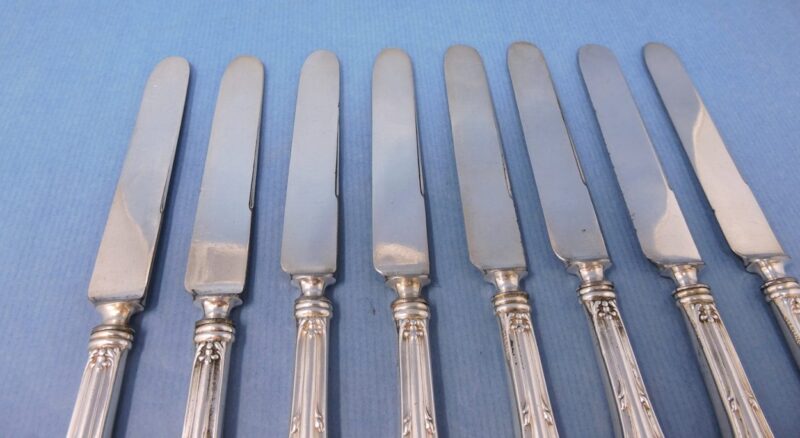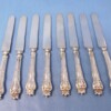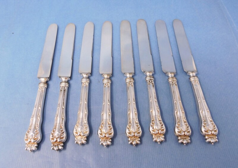 A lovely set of 8 sterling silver luncheon size knives by the Mt. Vernon Co. in the rare “Queen” pattern.