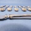 Each knife is stamped “Sterling” on the side of the handle and has been stamped with a figure holding a club near the tip of the handle.  The blades are silver-plated and are in a “paddle” shape.