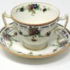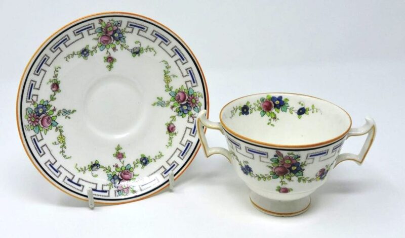 A lovely set of 8 Royal Doulton England bone china two-handled soup cups and matching under-plates.  The cups and under-plates have a white background, decorated with floral sprays and greek key pattern as well as gold trim.