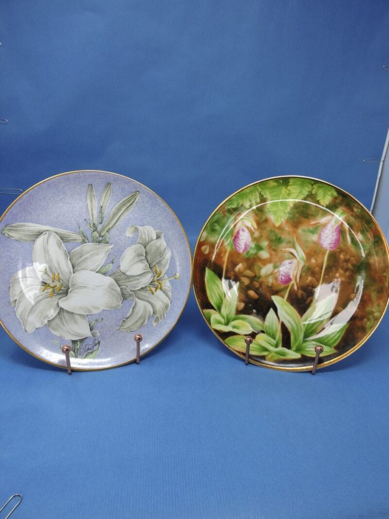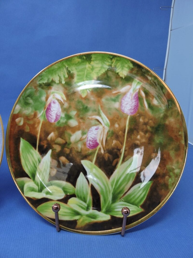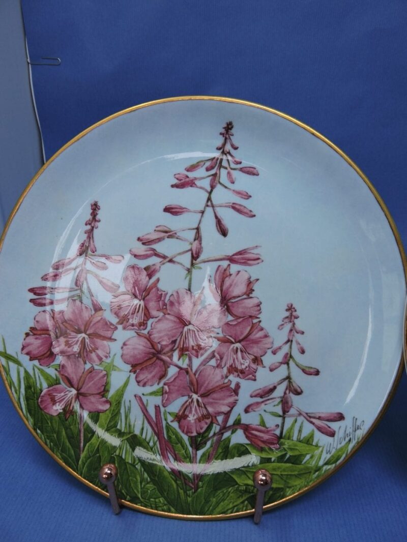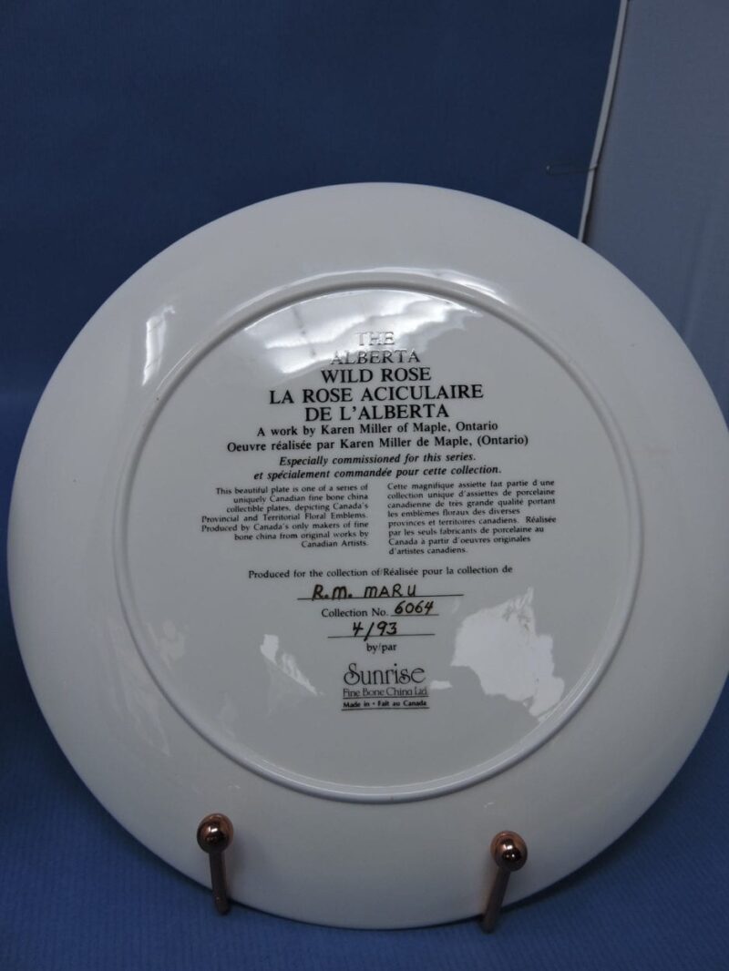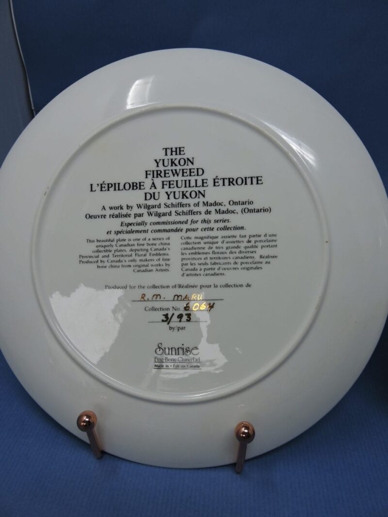 Here is a great set of 9 Sunrise bone china collector plates showing the Provincial and Territorial floral emblems, created in 1992 /1993 by two Canadian artists, W. Shiffers and K. Miller. Each plate is part of the collection, numbered “6064”. Each plate is wonderfully painted and has a gold rim.