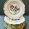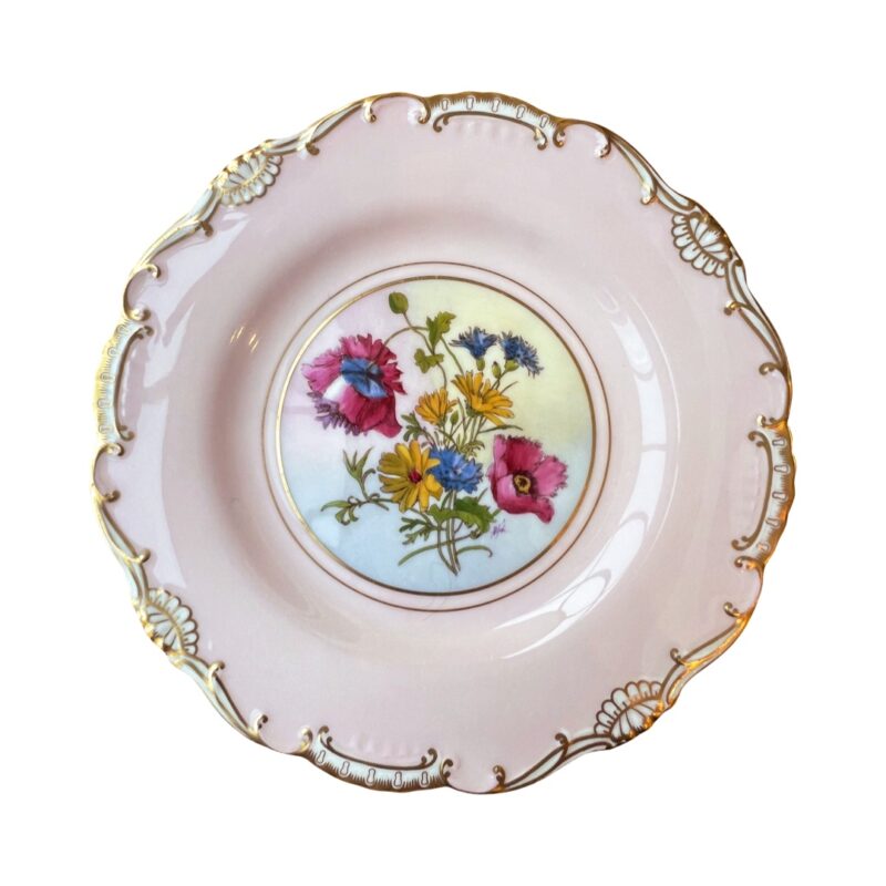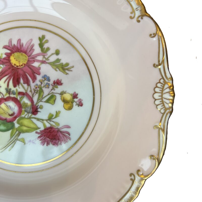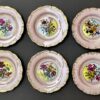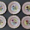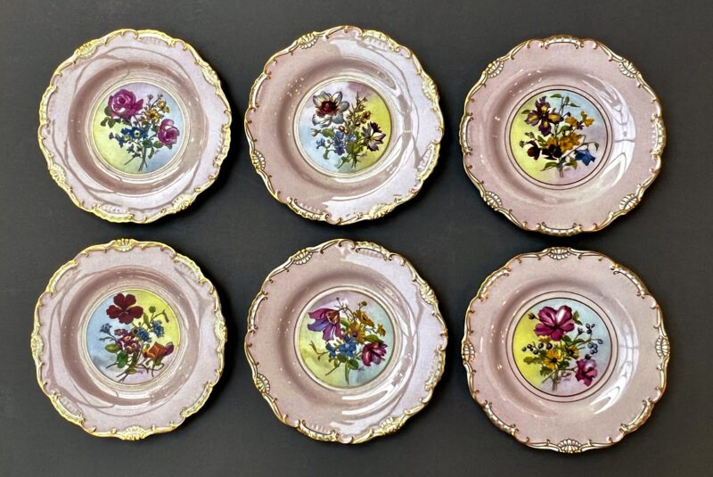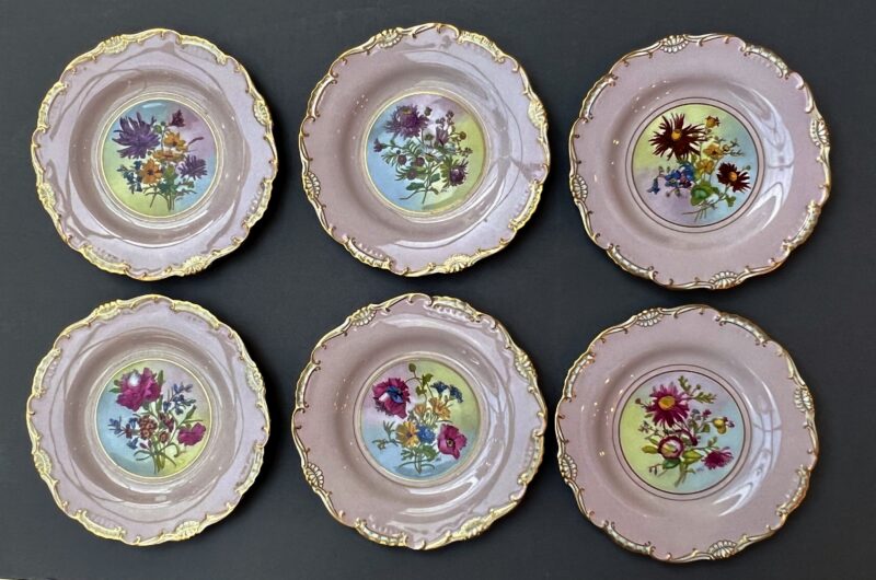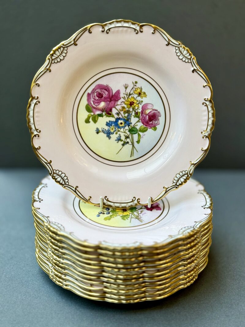 China Patterns, PorcelainsThe uniqueness of each plate with a different floral bouquet and being handpainted by Mintons’ artist A. Fox will be amongst the most fabulous cabinet sets you have ever seen. The central bouquet images are both delicate and natural as is the pastel pink colour of the plate rim. Each plate is elegantly framed with a gorgeous guilded edge.