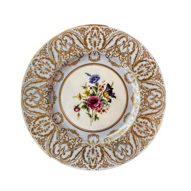 Sophisticated, in detail and colour, a wonderful set of twelve Royal Worcester bone china dinner plates made in England and dated 1950. Intricate gold filigree on an “egg shell blue ” ground, frames the central floral bouquet. Perfect in every way and in mint condition.
