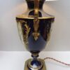 A gorgeous Sevres France painted (cobalt blue and gold) porcelain table lamp with figural, musical instruments, and scenic decorations and a fleur-de-lis finial. The lamp has a cream coloured shade and a bronze base.