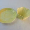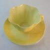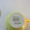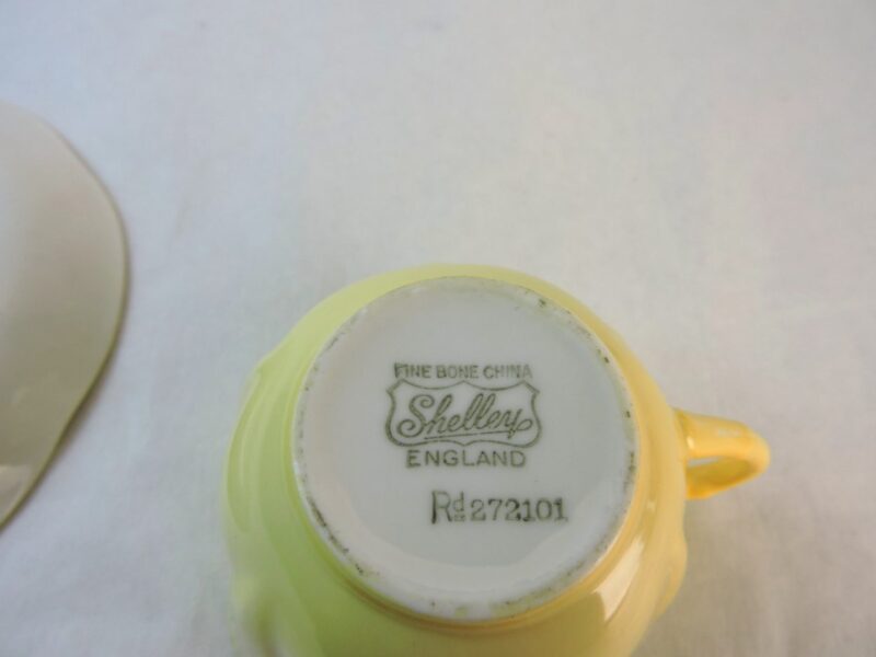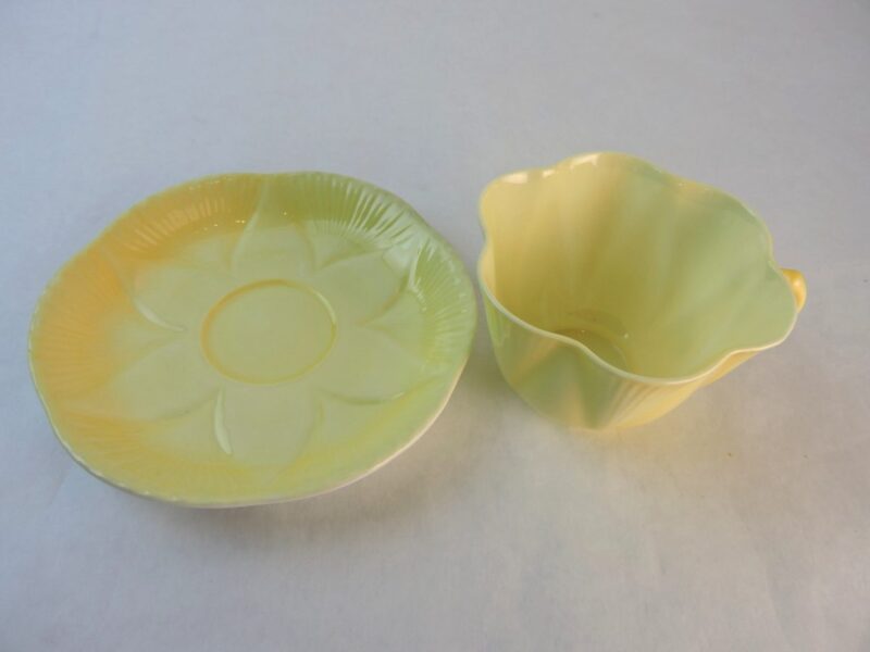 The cup and top side of the saucer are decorated in a lovely pale yellow with panels of lines and a scalloped rim on the cup and a petal pattern with the same panels of lines on the saucer. The underside of the saucer is white.