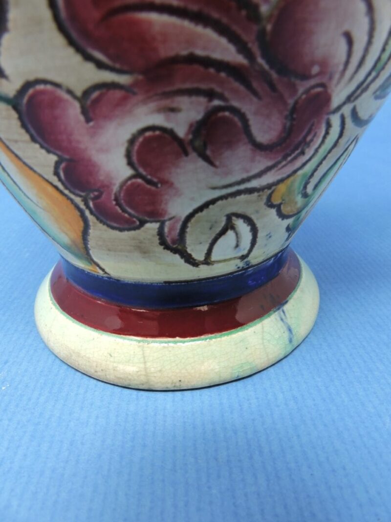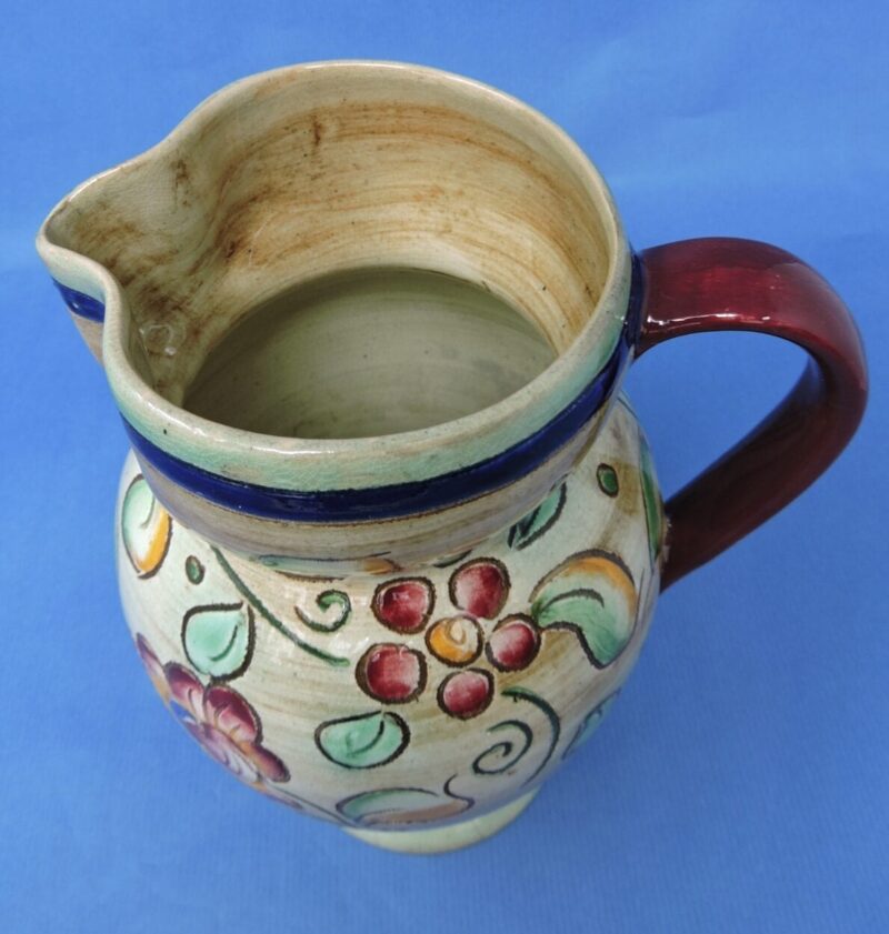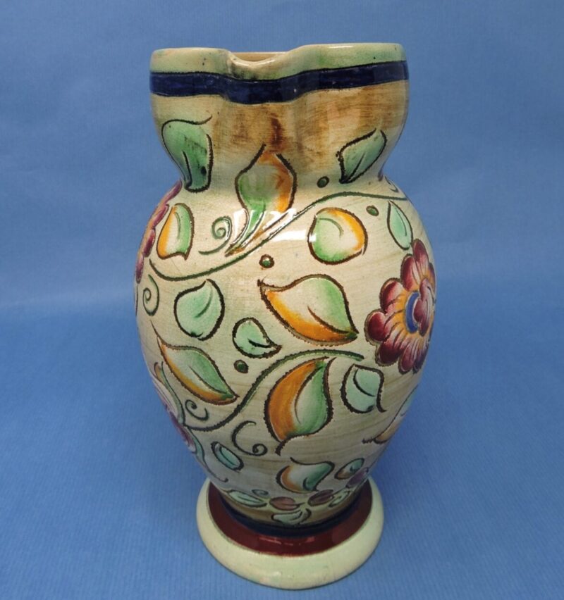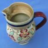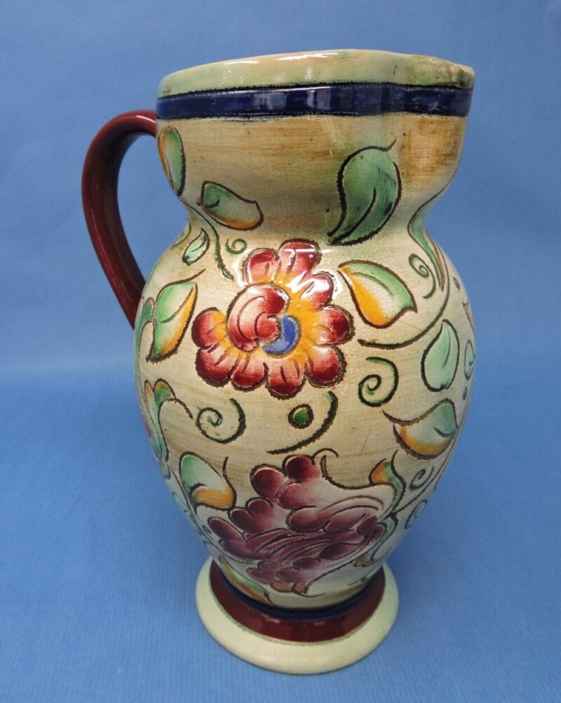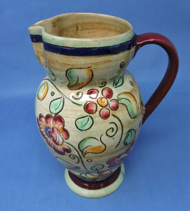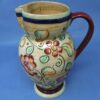 Here is a lovely, colourful pottery jug by Shorter & Son England. It is decorated with floral designs and bands of different colours by Mabel Leigh.