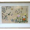 A lovely, colourful Chinese silk painting in a bamboo style wood frame. The painting shows 2 birds on a branch of blossoms above a vibrant flower garden with 2 butterflies flying freely around. The painting is signed and stamped in Chinese characters on the upper right hand side.