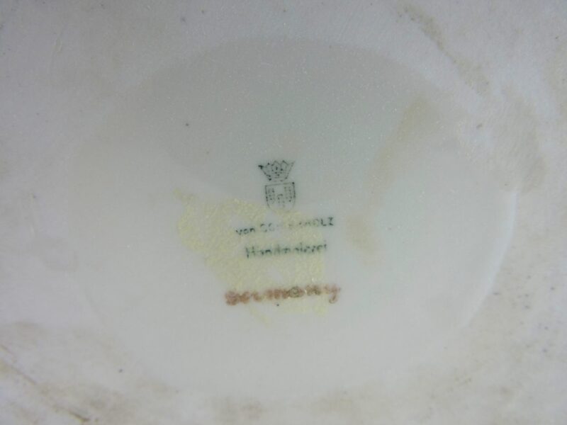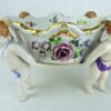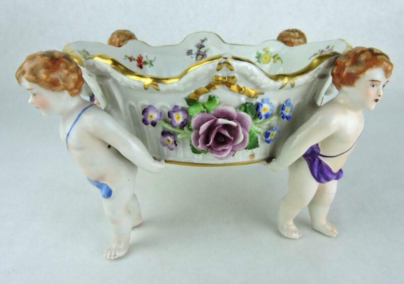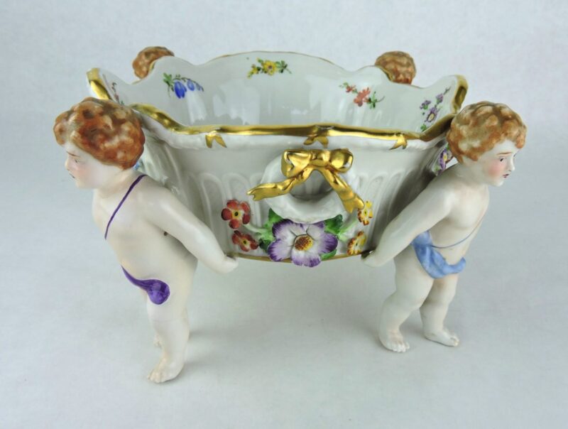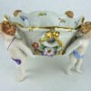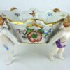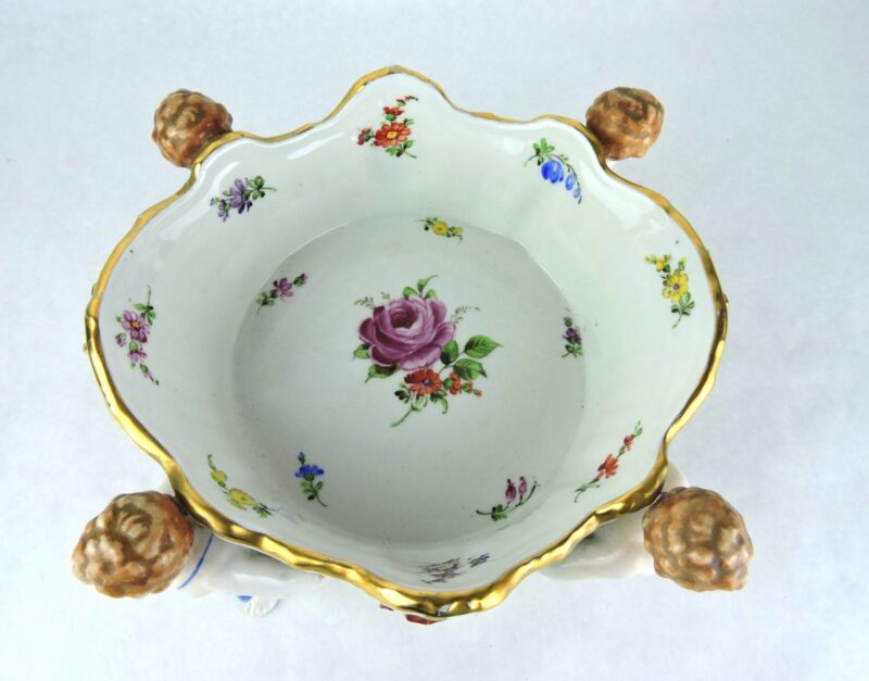 Here is a lovely signed German porcelain open bowl, circa 1900. The bowl is supported by four Putti figures and decorated with flowers and gilt on the scalloped rim of the bowl. There is a German company mark of a shield over crown and marked “Germany” on the underside.