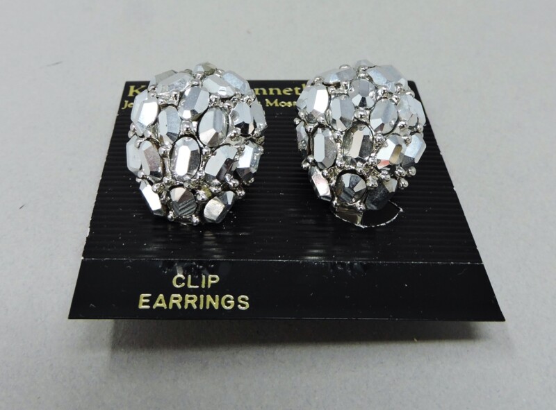 A wonderful pair of signed Kenneth Lane vintage clip on earrings on the original card. The earrings are a shiny silver colour and have a silver tone backing. They are signed “Kenneth Lane” on the inside of each earring body. The card reads “KJL by Kenneth J Lane. Jeweler to the World’s Most Admired Women”.
