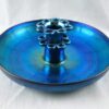 The bowl and frog are both decorated, inside and out, with irridescent “butterfly wing” blue. The bowl has a raised peacock feather design in the glass, radiating out from the centre.