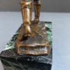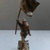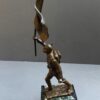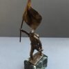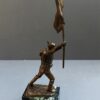 The bronze is mounted on a black and white marble base. The bronze measures 13 inches tall from the tip of the flag to the base and the base is 3 3/4 inches deep x 2 1/8 inches wide.