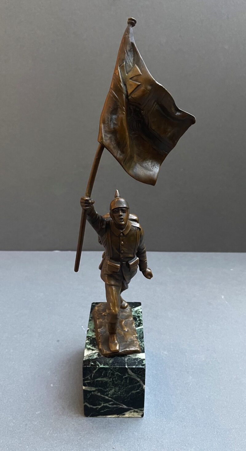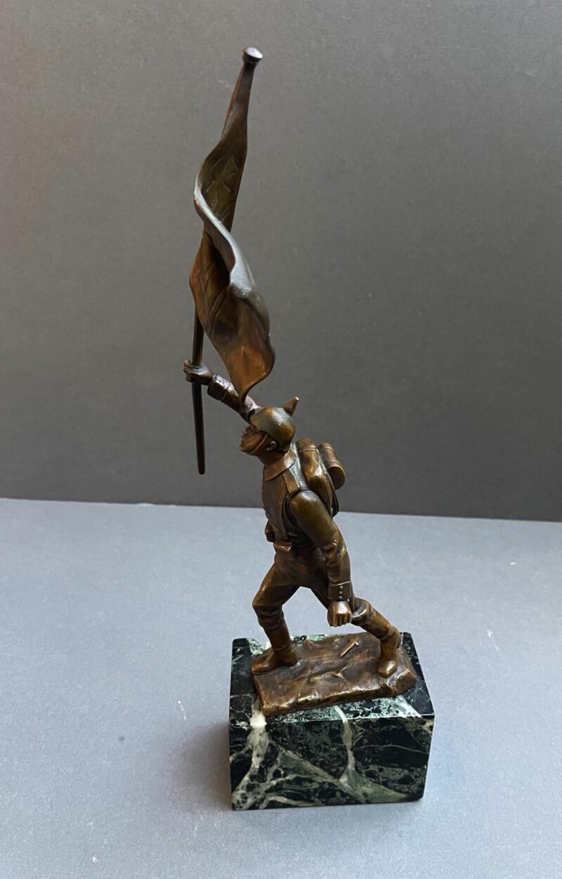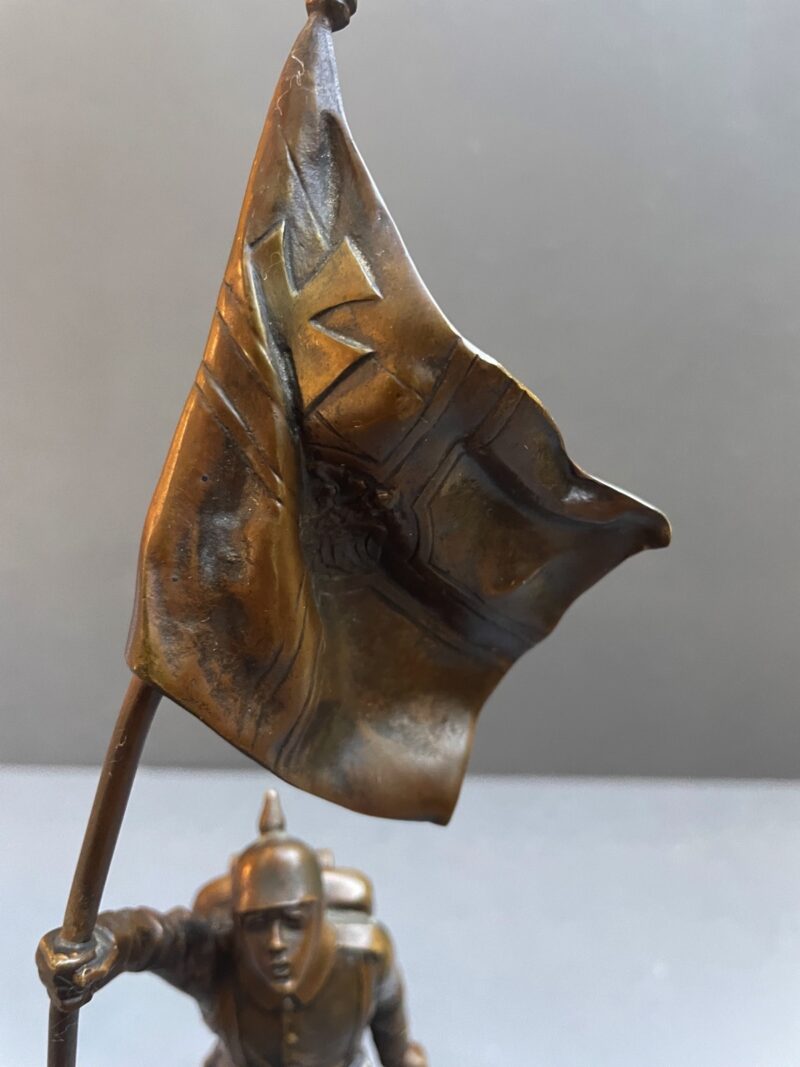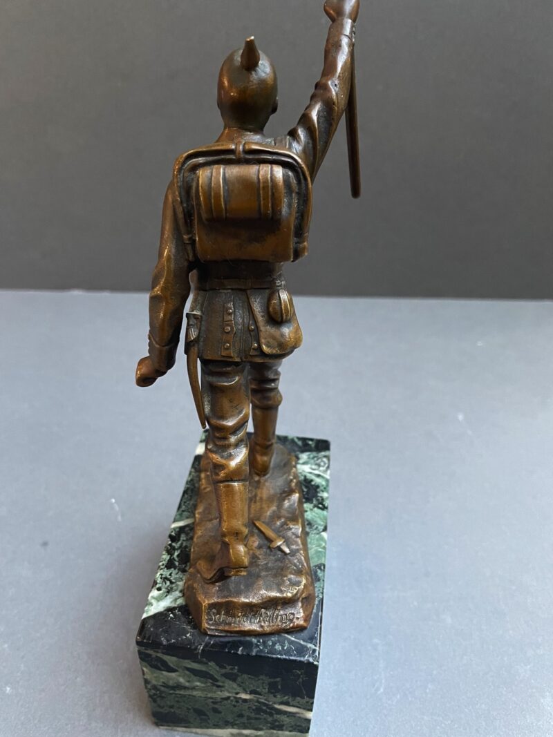 A lovely bronze figurine of a German World War 1 soldier with a raised German flag in his right hand. The figurine is sculpted by Julius Schmidt-Felling and is signed “Schmidt Felling” on the back. Julius Schmidt-Felling was a German sculptor who was born in Berlin in 1835 and died in 1920.