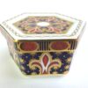 A lovely small hexagonal-shaped, bone china lidded box, by Royal Crown Derby, in the Imari pattern. The box has a white background with colourful patterns in red, blue and gold with gold trim and gold accents. On the underside of the lid and box is the Royal Crown Derby maker’s mark as well as the writing “Royal Crown Derby English Bone China” as well as “A1297”.
