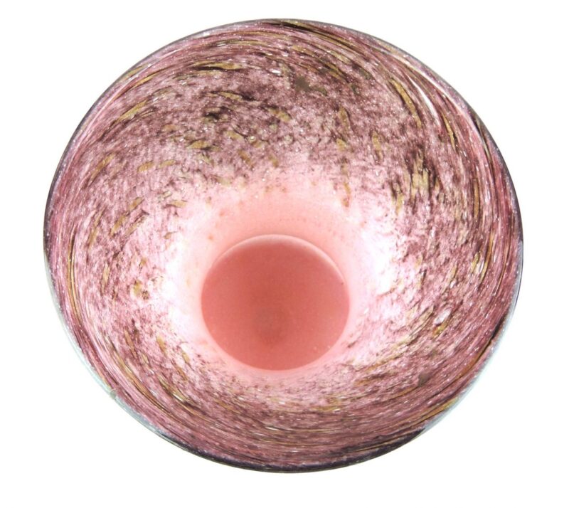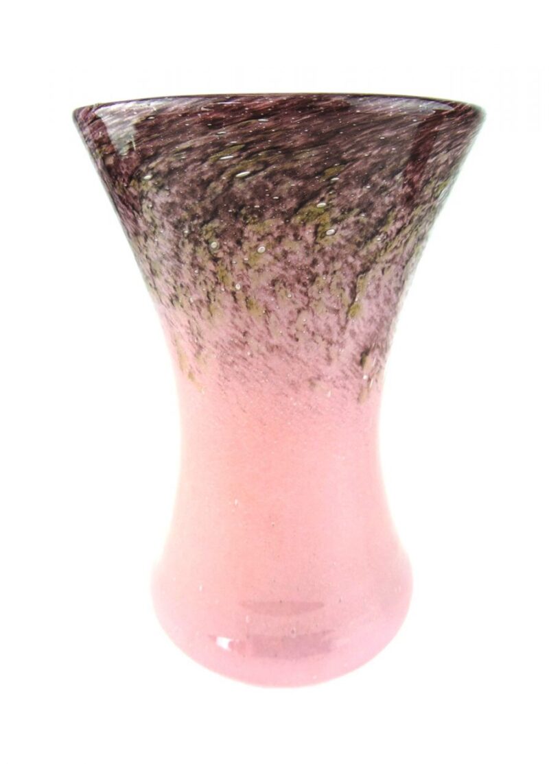 The vase is primarily pink glass with darker pink, black and gold swirl patterns.