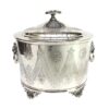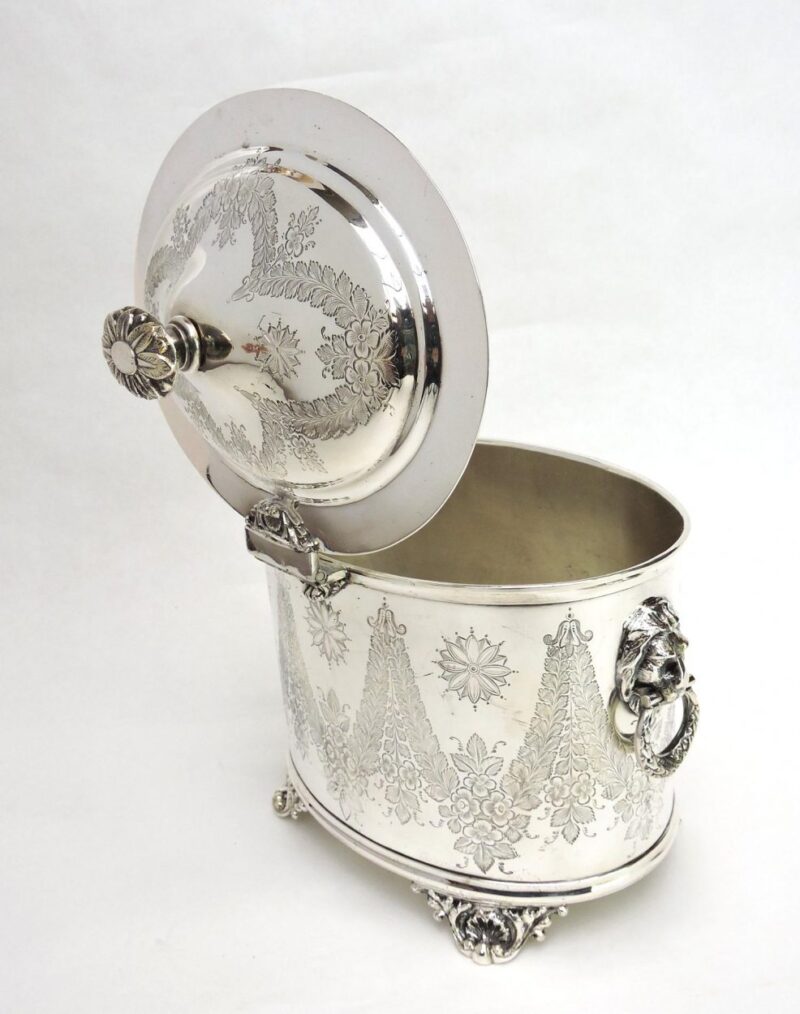 A lovely hand chased silver plated biscuit barrel having a hinged lid and lion’s head side handles.  The body is oval with lots of room for many biscuits inside.  The barrel sits on 4 raised feet.