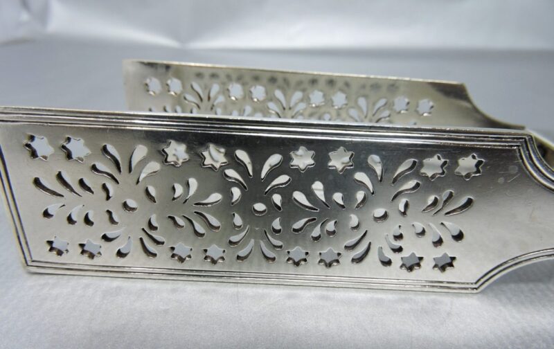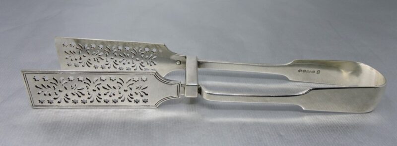 A wonderful silver-plated asparagus server with pierced decoration on the blades and a slide mechanism.