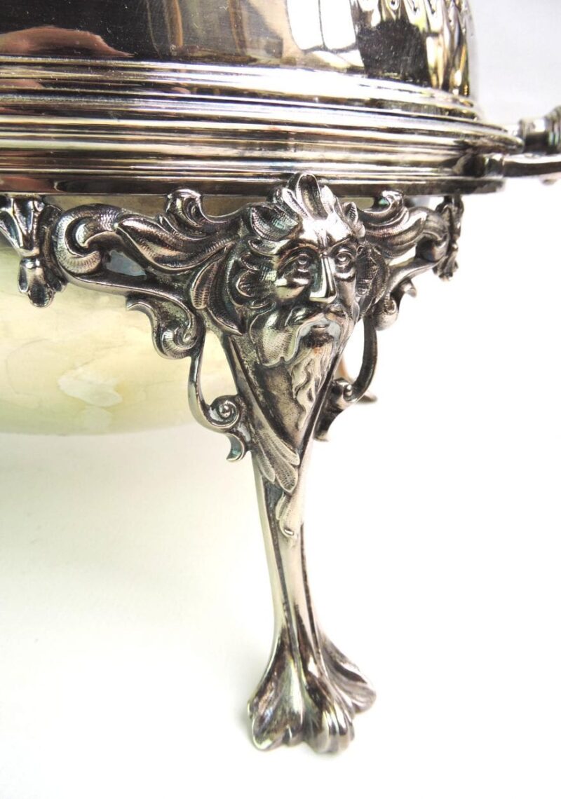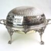 Here is a gorgeous silver-plated, repousse decorated, covered roll top entree serving dish with two handles and removable interior pieces including a pierced “strainer” and an entree dish. The lid is hinged and is a “roll-top”. The feet of the dish are decorated with “claw” feet and show a face at the top of each foot. Please see the second photo in the gallery for details.