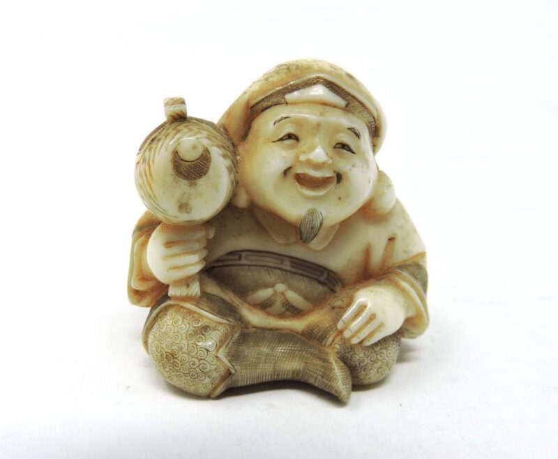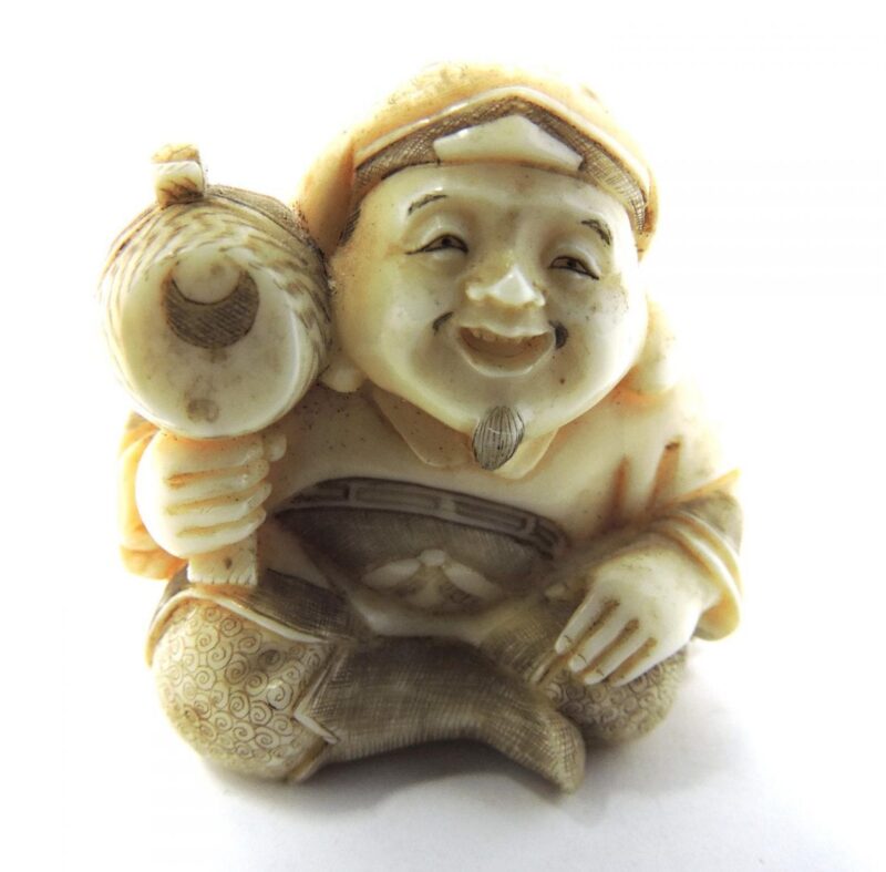 v** SOLD ARCHIVES **vHere is an adorable small, carved and signed Japanese ivory netsuke of a man sitting with his legs crossed and holding a hammer upright in his right hand. There is lovely detail on his robes and hat and hammer. Dates circa 1900.