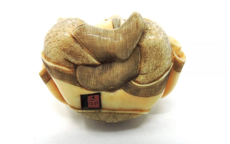 The netsuke is signed on the underside with an Asian character and the letters “AP”.