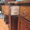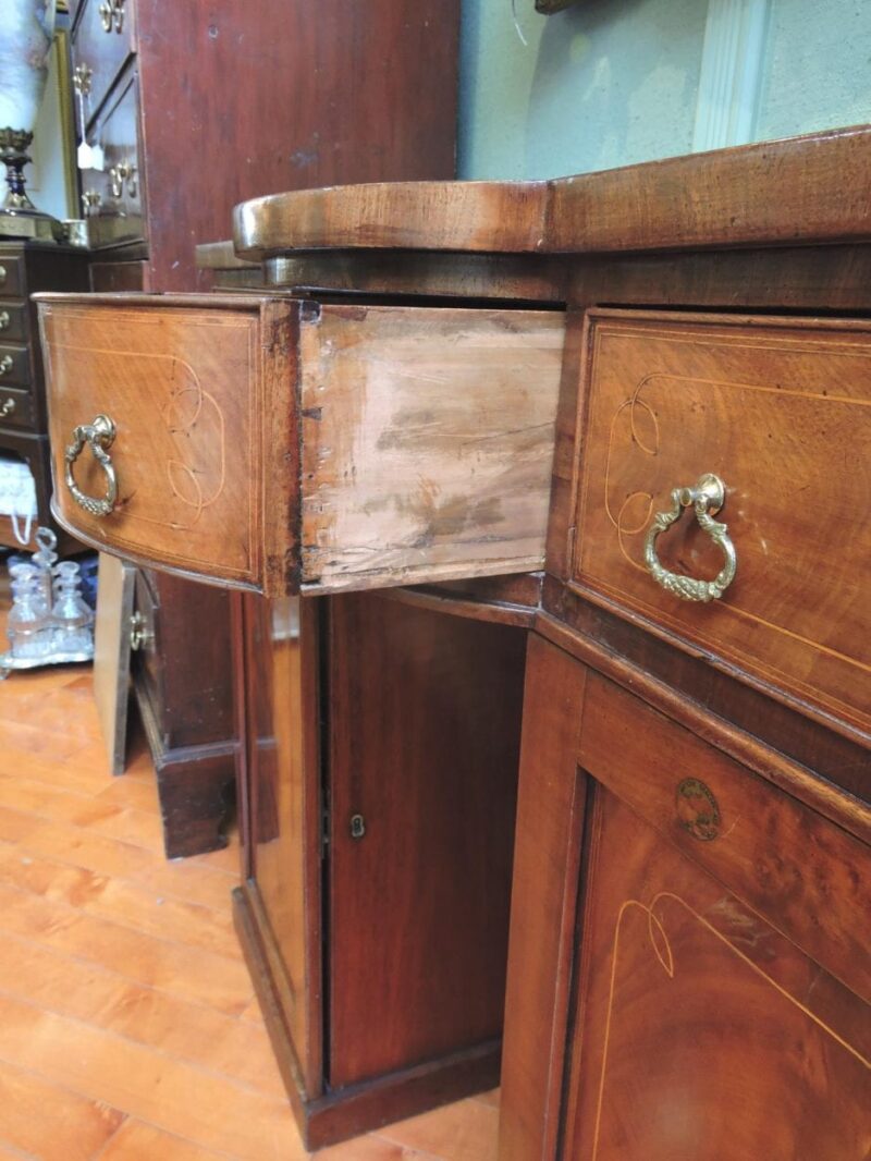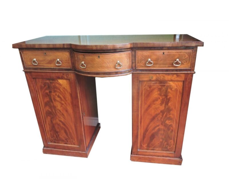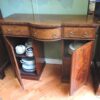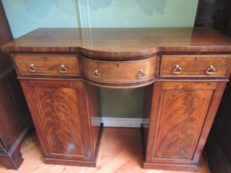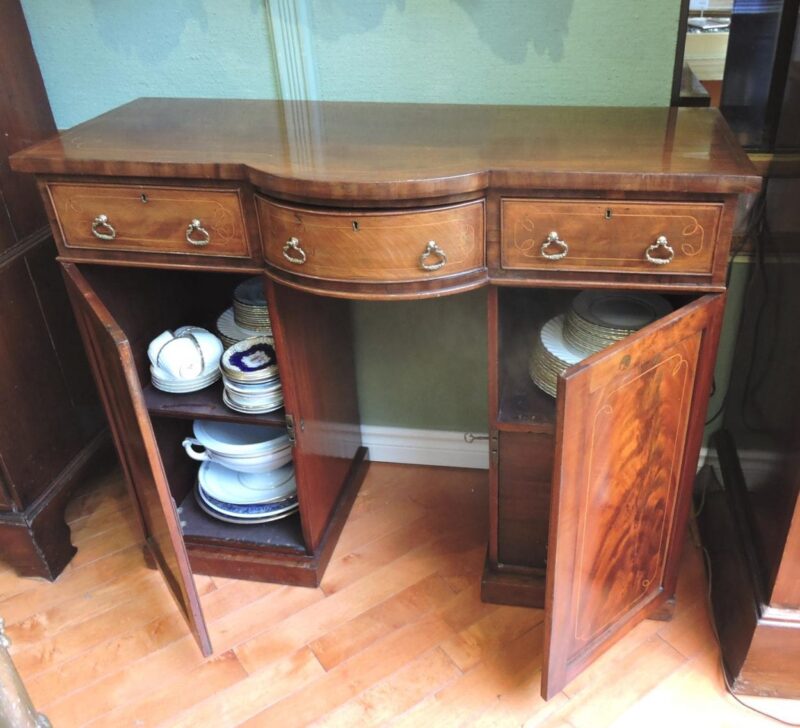 A wonderful English mahogany server with 3 top drawers (the centre one is curved out) and two tall side doors which open to reveal two shelves on each side.  The piece has satin wood inlay in a swirl pattern on the top and around the handles on each drawer.